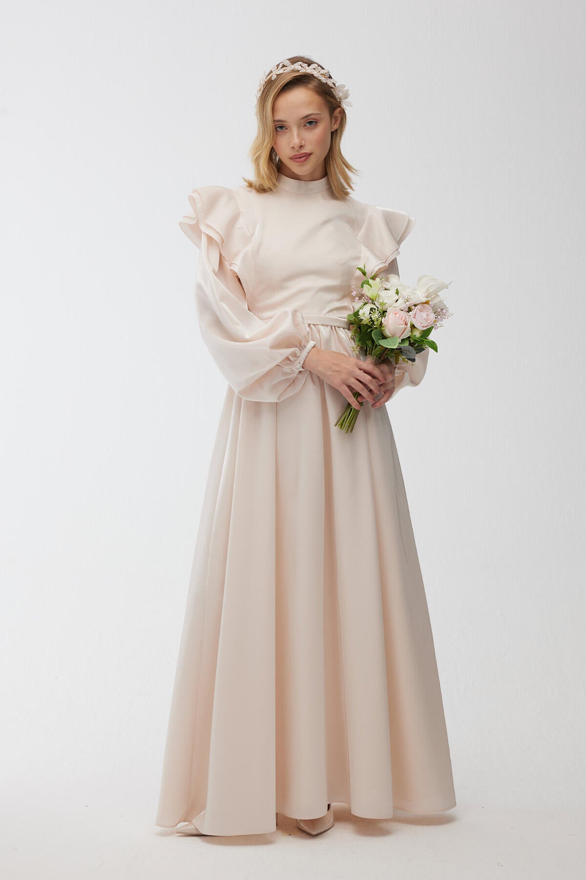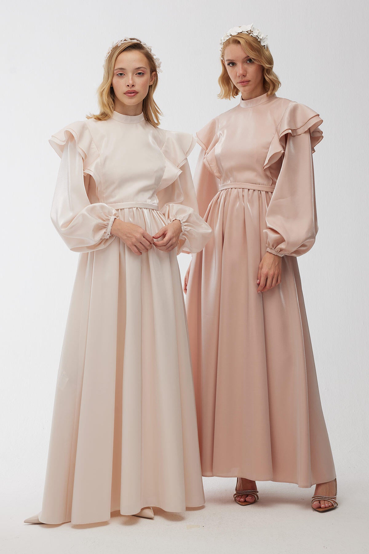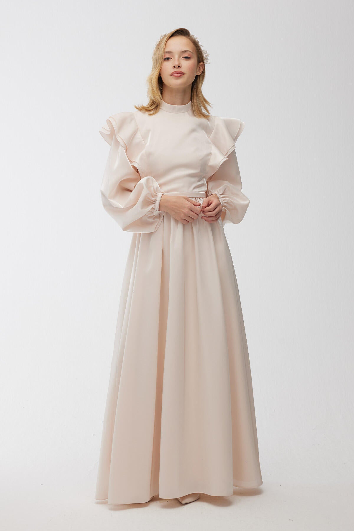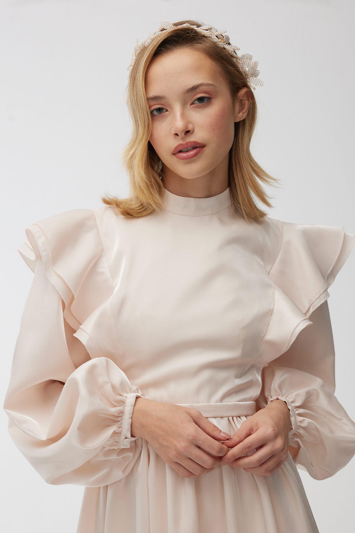 This dress features a high neckline and voluminous balloon sleeves, creating a silhouette that's both dramatic and effortlessly elegant. The shoulders are adorned with ruffle details, adding a layer of sophistication and movement to the design. Crafted from self-illuminating organza fabric, this dress captures and reflects light, ensuring you dazzle from every angle. The skirt gathers delicately, thanks to a tasteful ruching detail, enhancing the dress's overall femininity. Fully lined for comfort and modesty, it comes complete with a fixed belt, cinching the waist and providing a flattering fit.