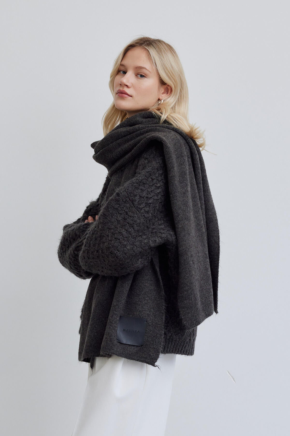 Crafted from thick knitted fabric with a plush feel, this piece ensures warmth and comfort all day long. The rectangular shape offers versatility in styling, allowing you to drape it elegantly or wrap it snugly around your neck. Adorned with a leather Manuka label, it adds a touch of sophistication to your ensemble. Made from a blend of 79% acrylic and 21% polyamide, it strikes the perfect balance between softness and durability, providing ample coverage while allowing for various styling options.