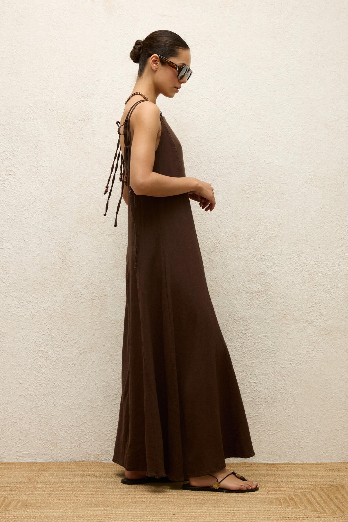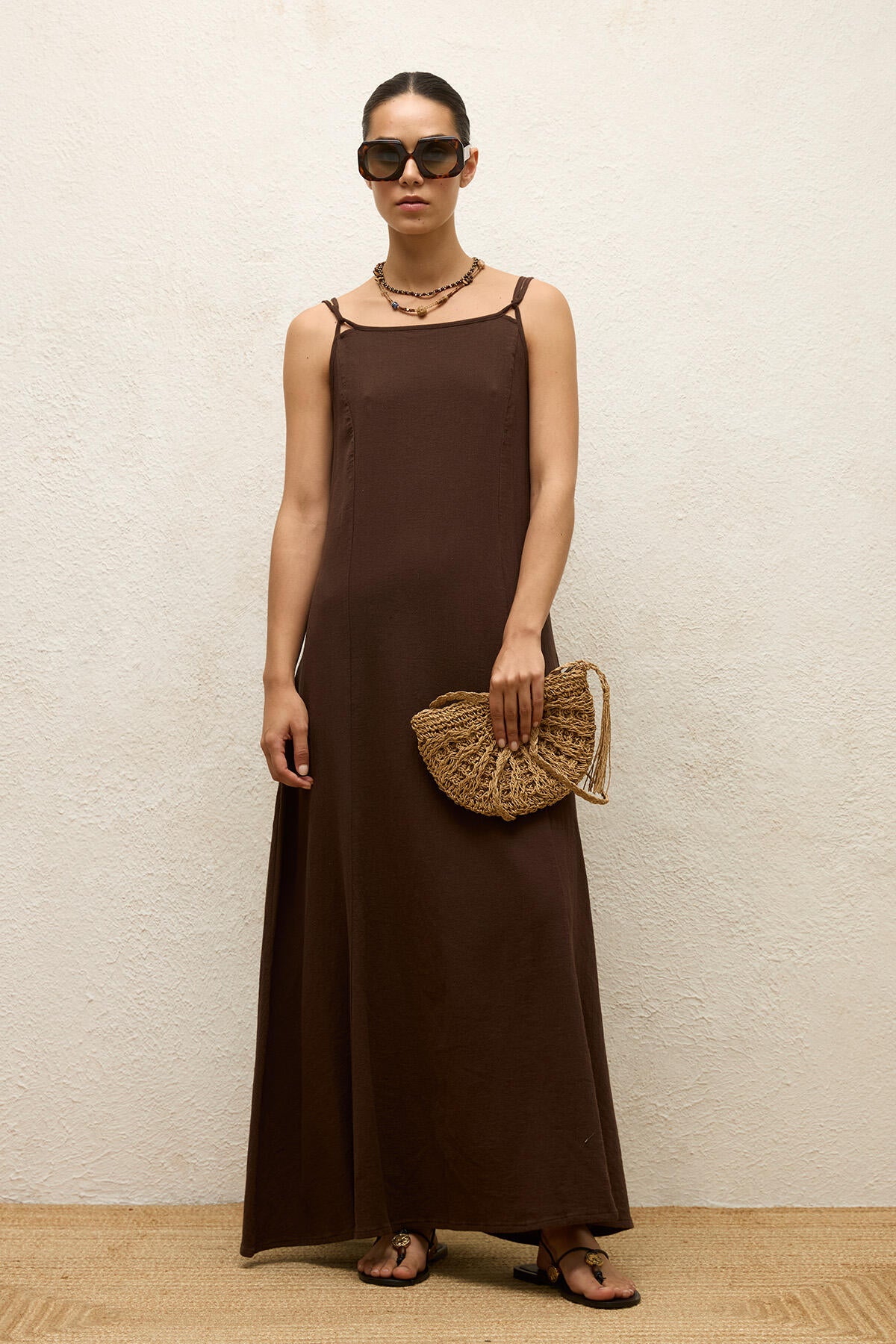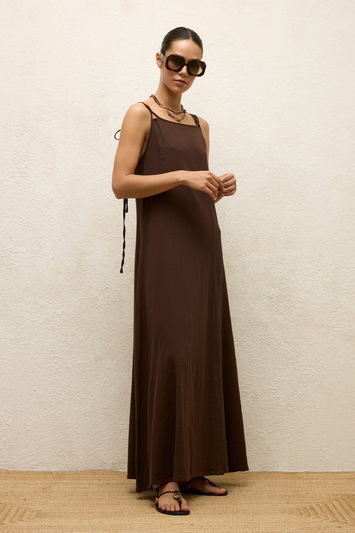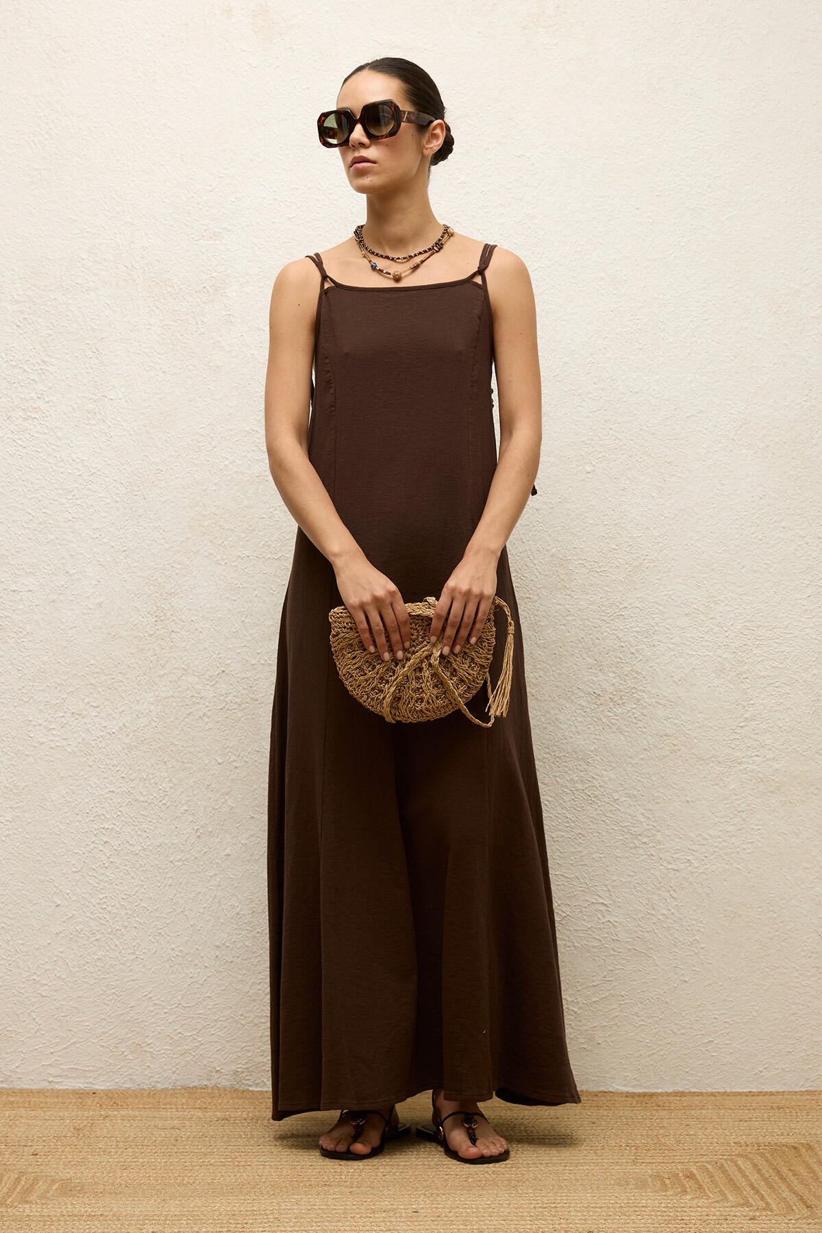 Adjustable free straps, wide skirt, cup details, zip closure.