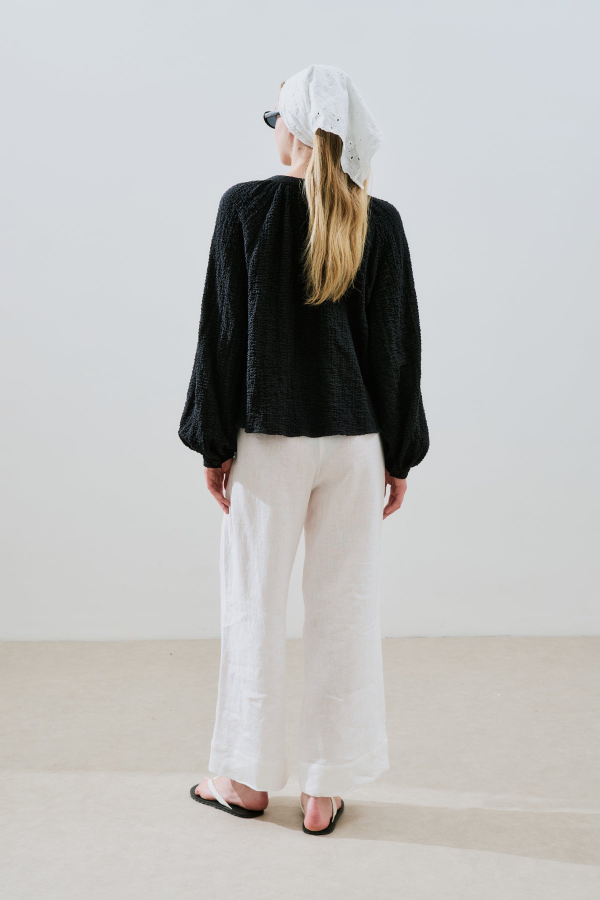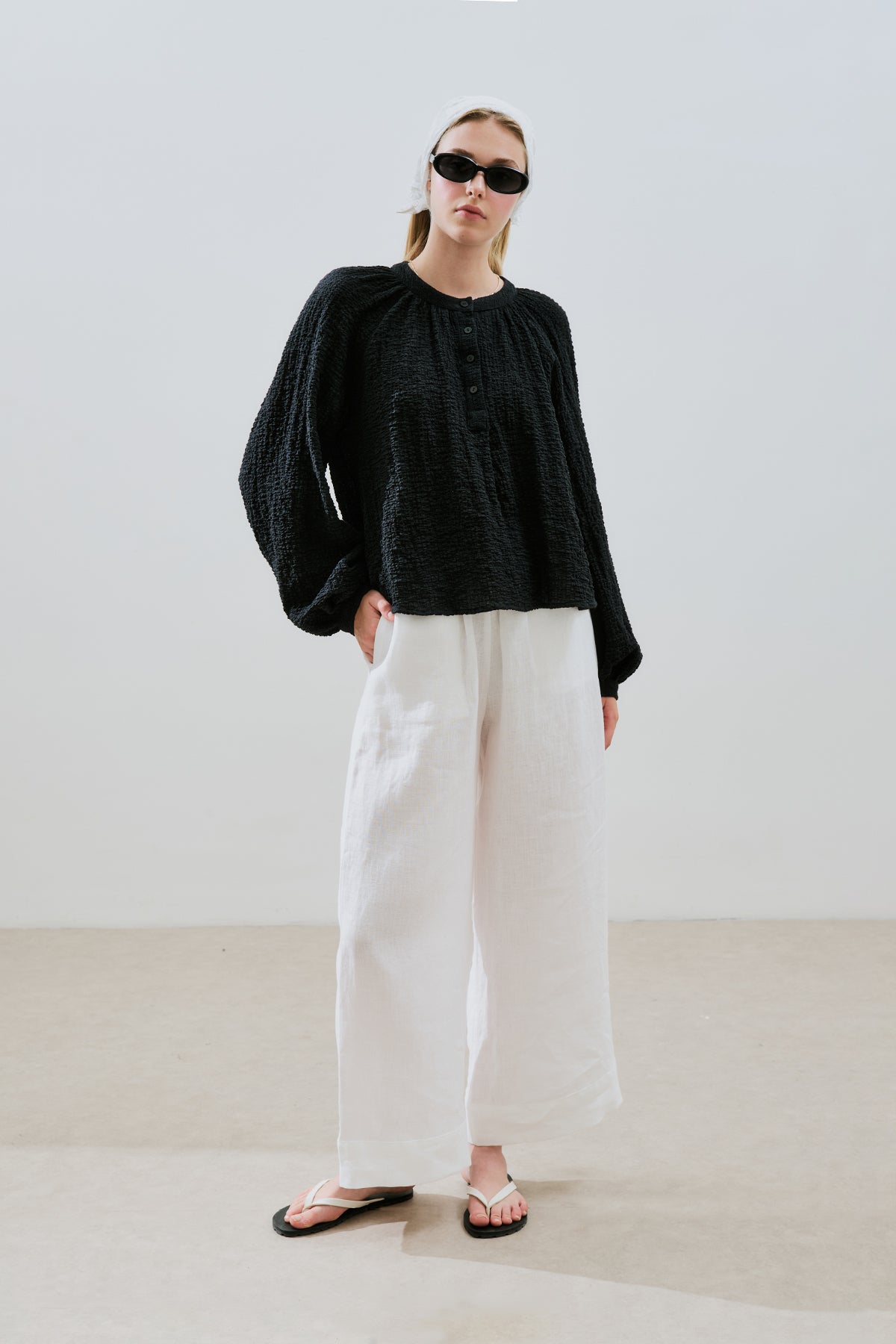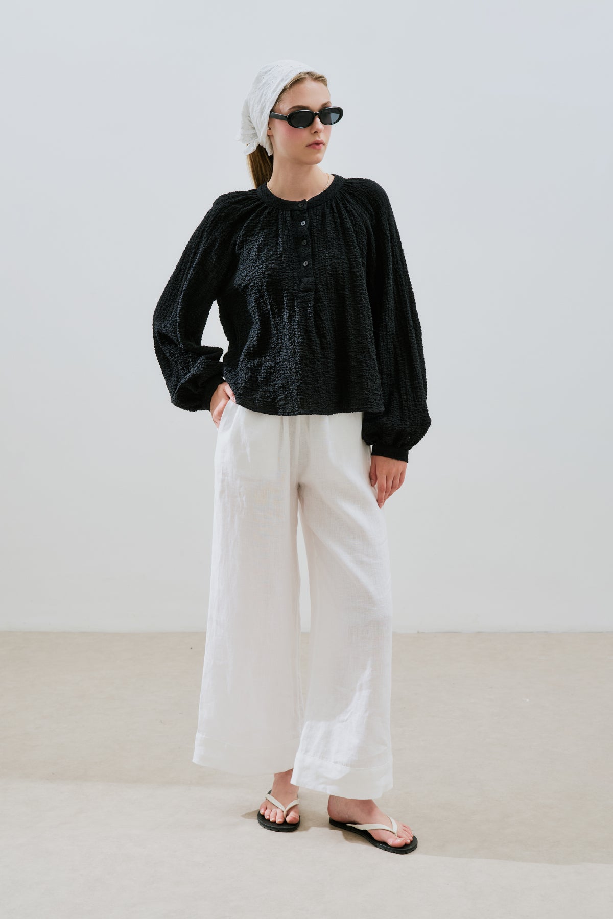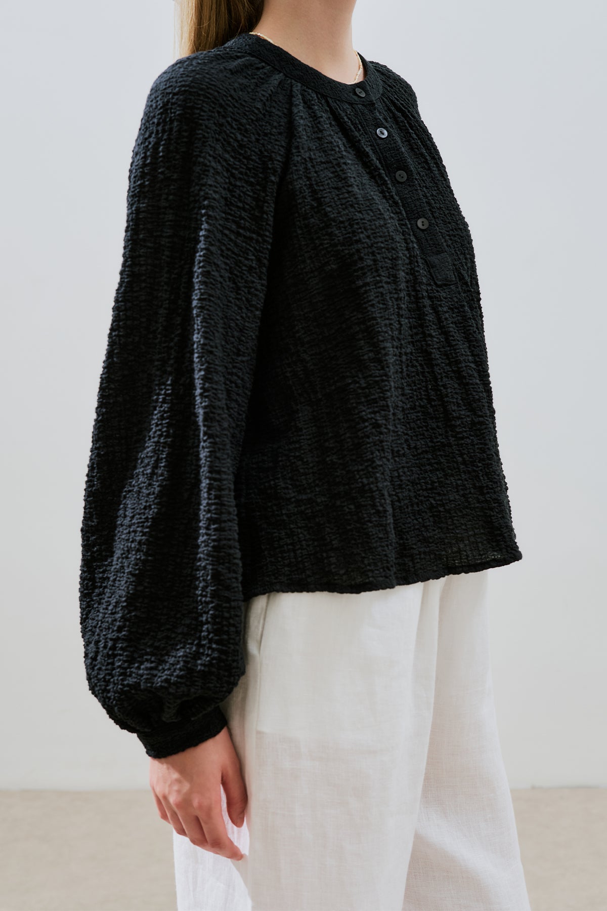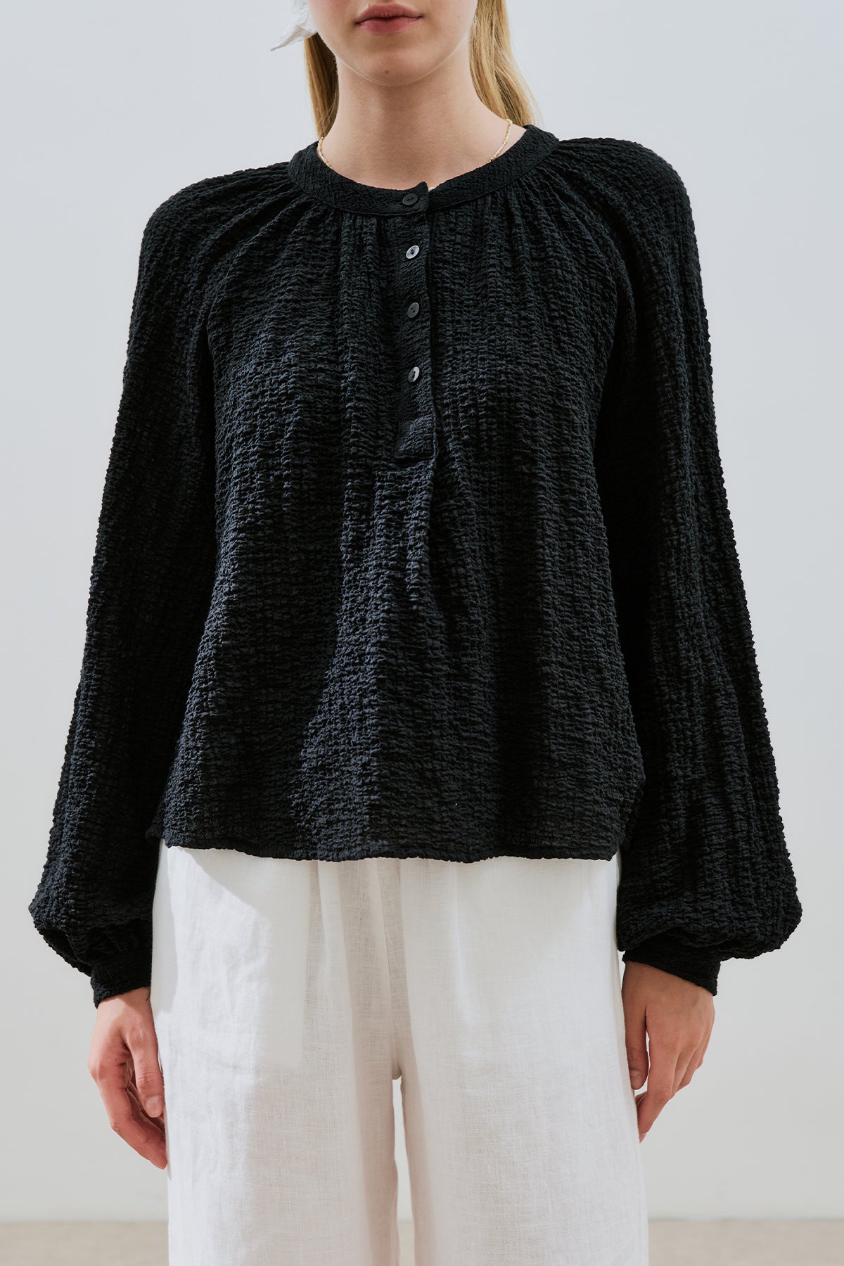 Textured Button-Neck Blouse Black