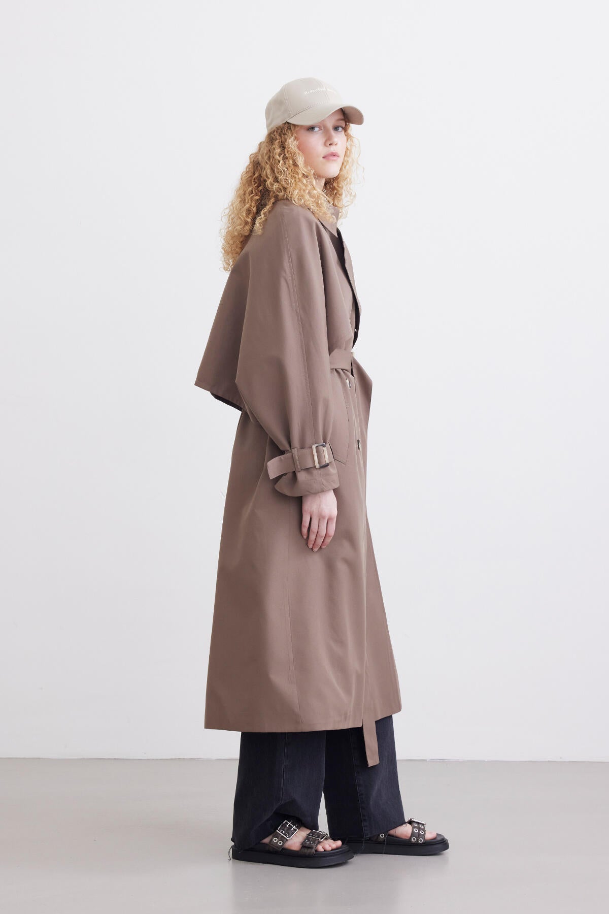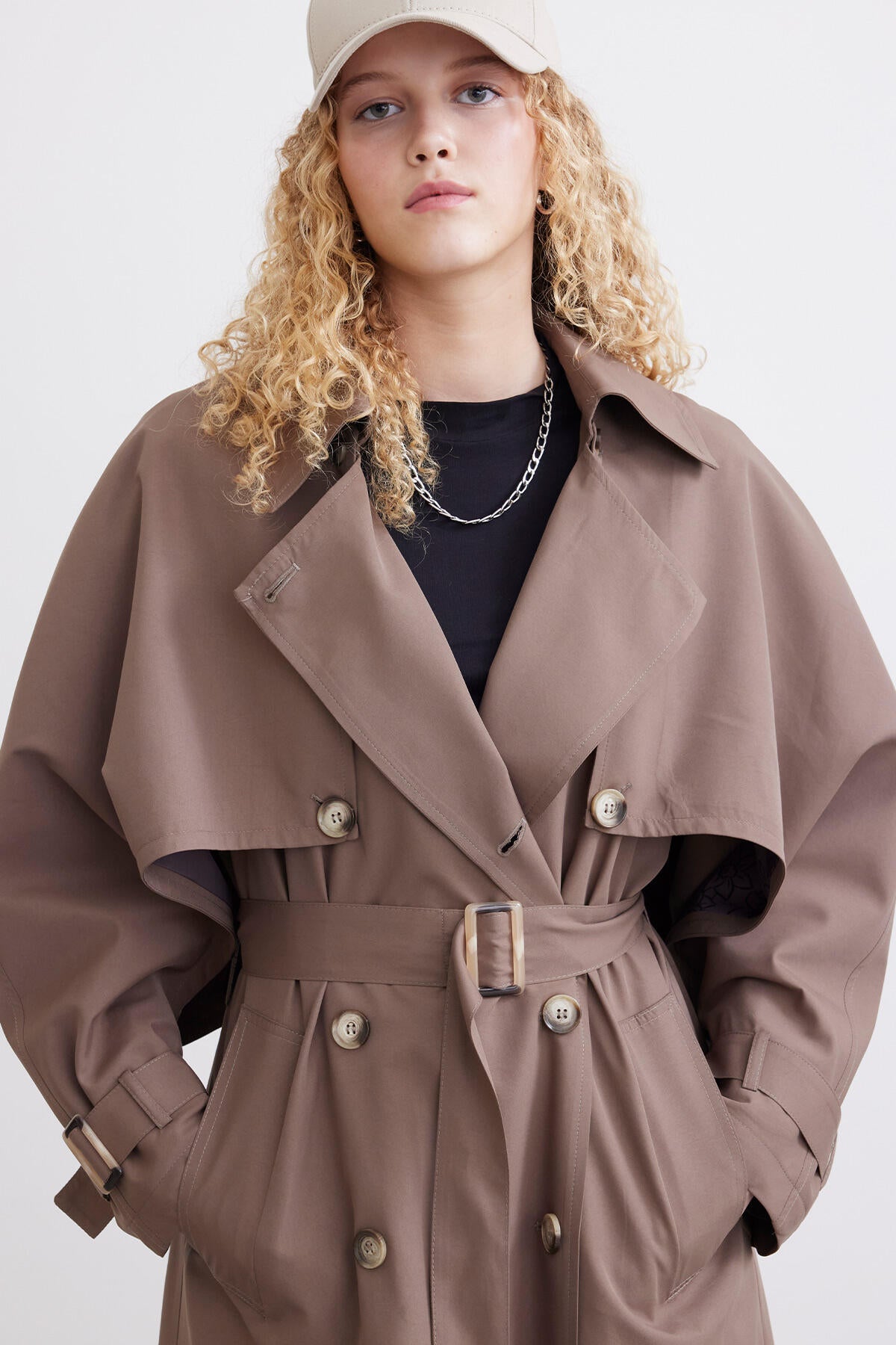 This trench coat is designed to adapt to your needs, offering two distinct looks in one garment. Featuring a detachable storm flap, you can effortlessly switch between a classic trench coat style and a sleek, streamlined look. The addition of epaulettes adds a touch of military-inspired sophistication, while the waist belt cinches in the silhouette for a flattering fit. The patterned lining adds a pop of personality when the coat is open, introducing an unexpected twist to the classic design.