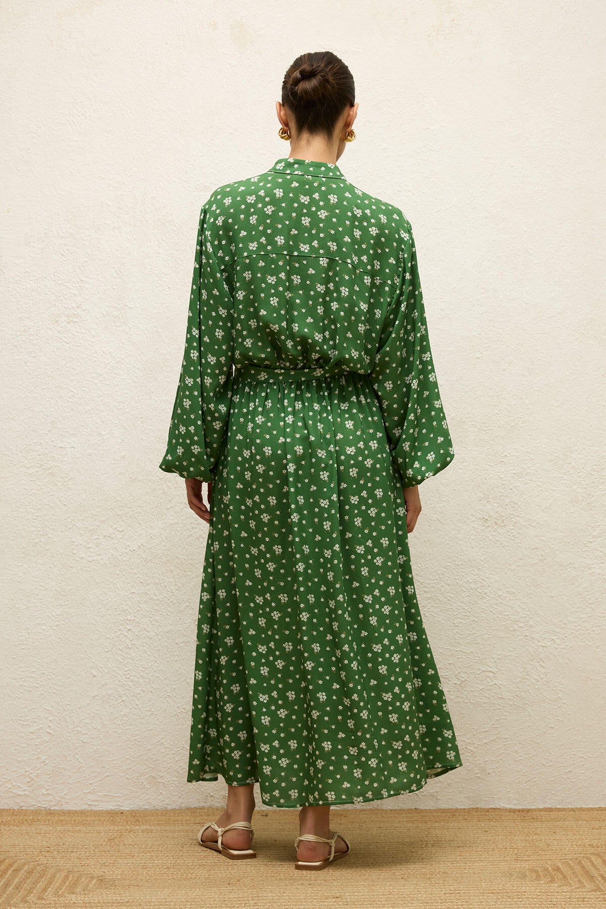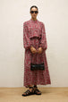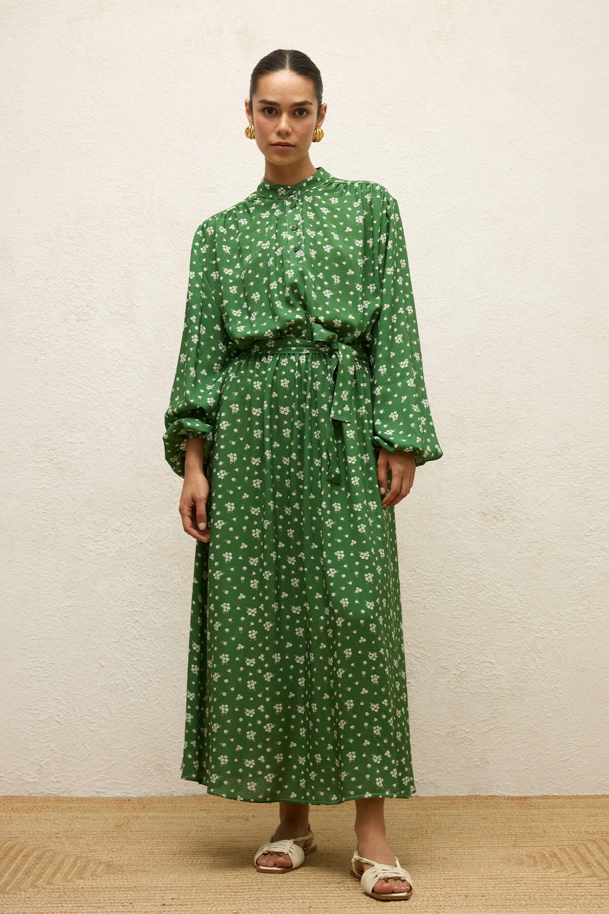 Round neck, balloon sleeves, elasticized waist and sleeve cuffs, belted, full-length, button closure, patterned viscose fabric.
