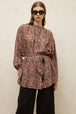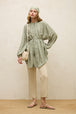 Round neck, button closure, gathered details, balloon sleeves, tasseled belt detail, tunic length, made from patterned viscose fabric.