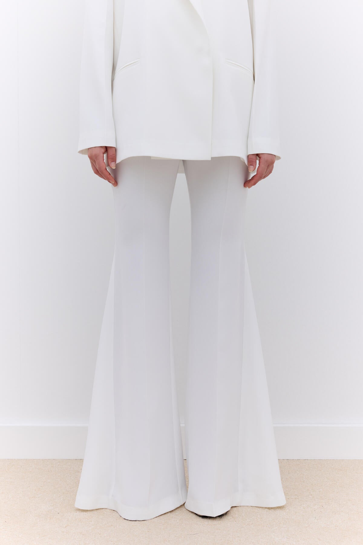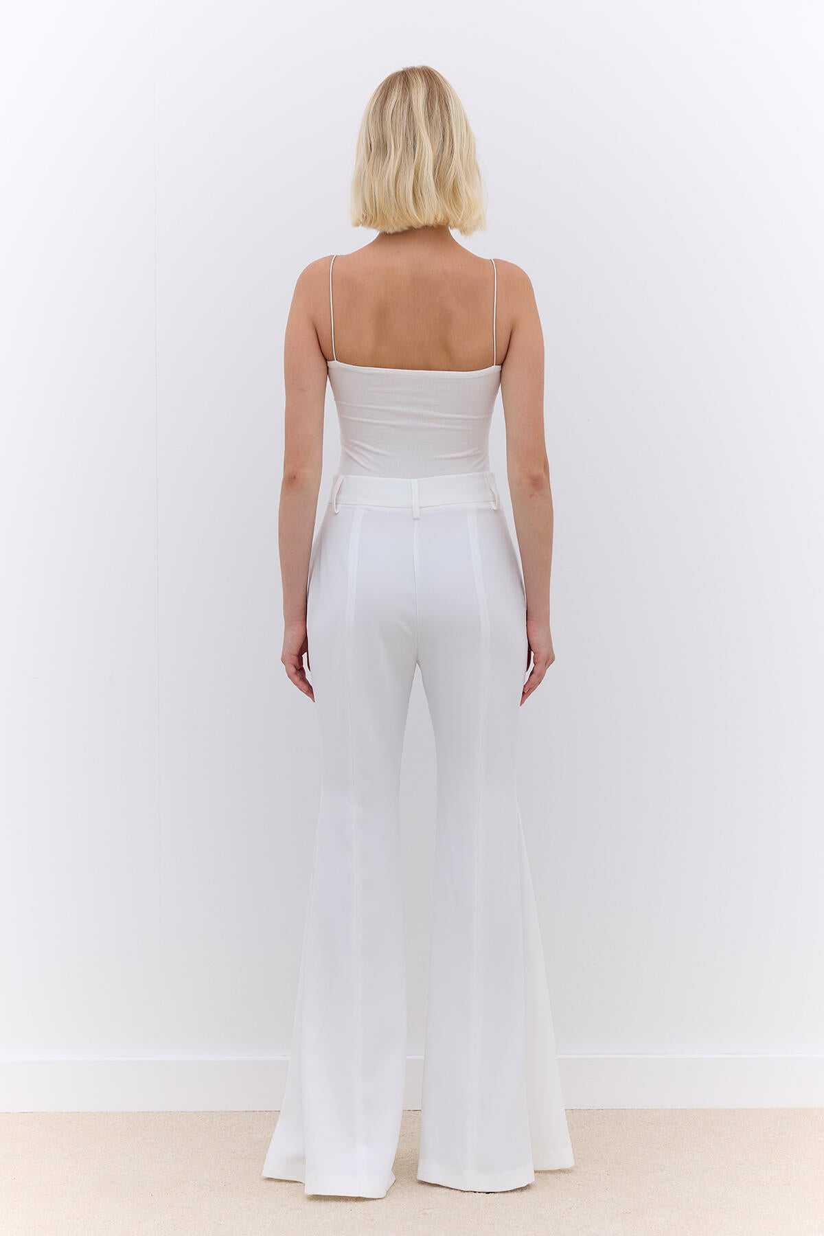 These high-waisted pants feature a zipper closure, wide legs, and a flared silhouette with dart detailing at the knee line.