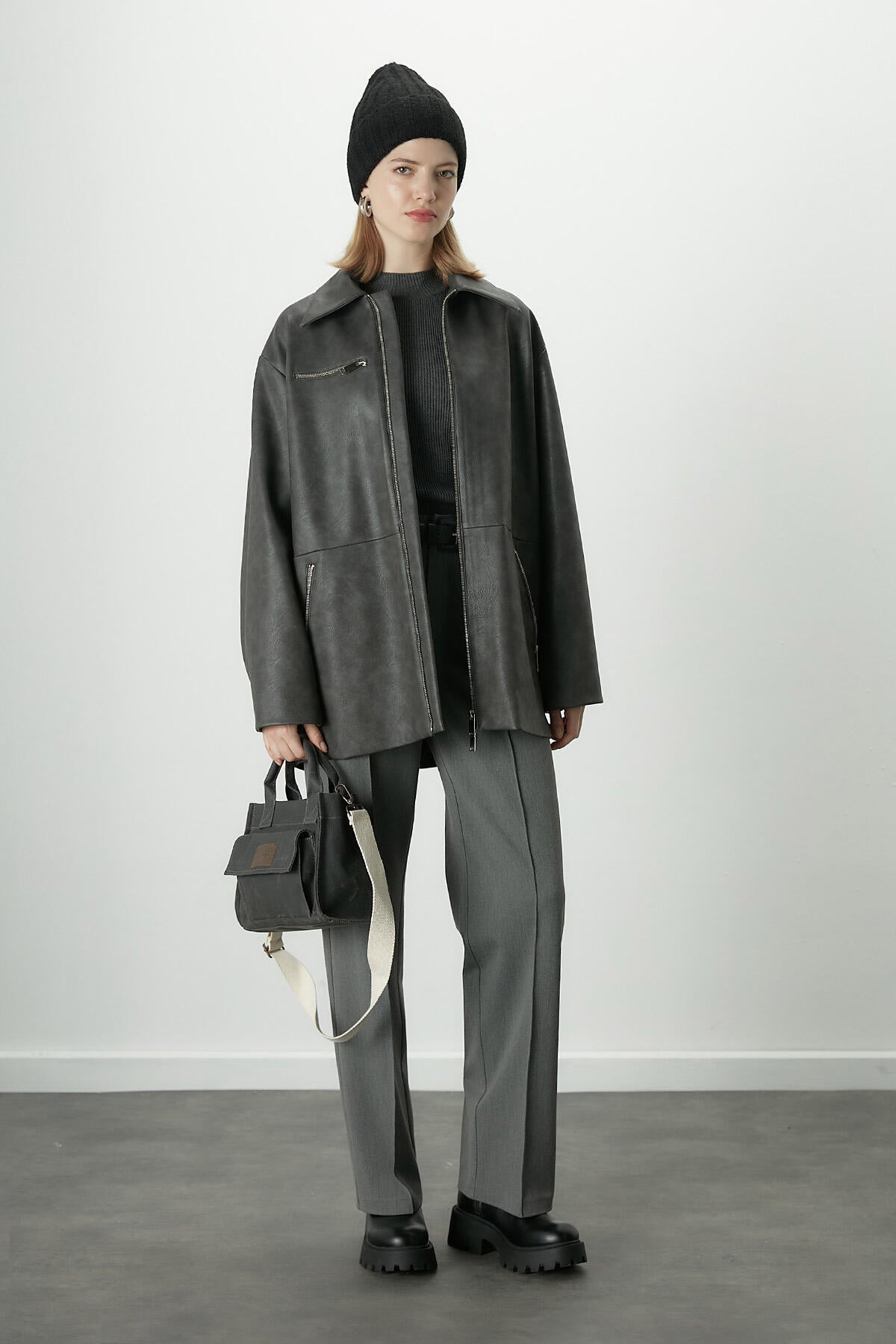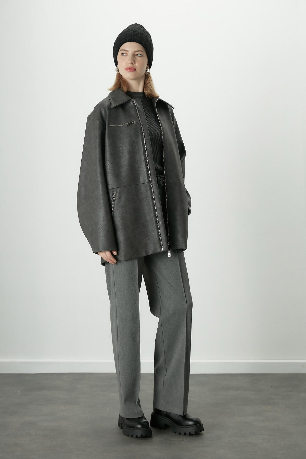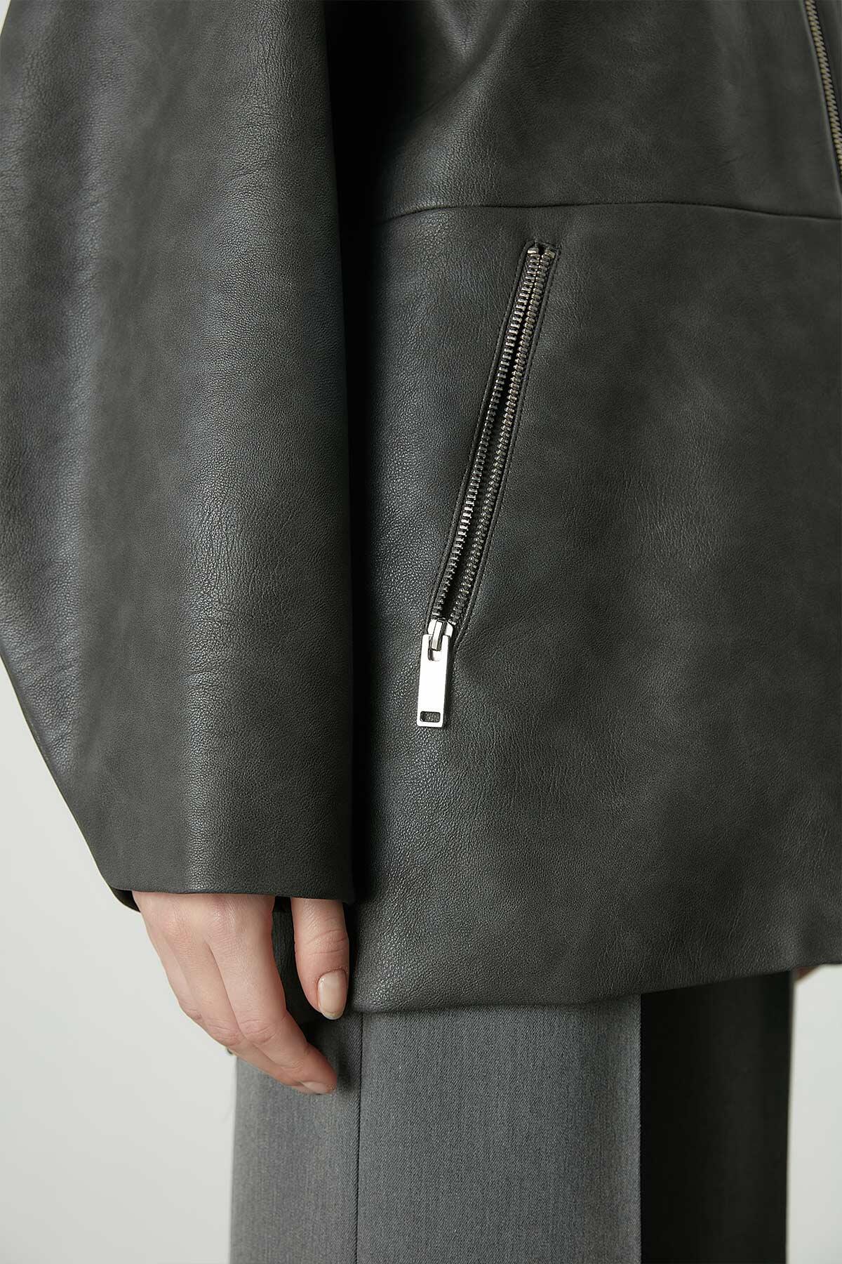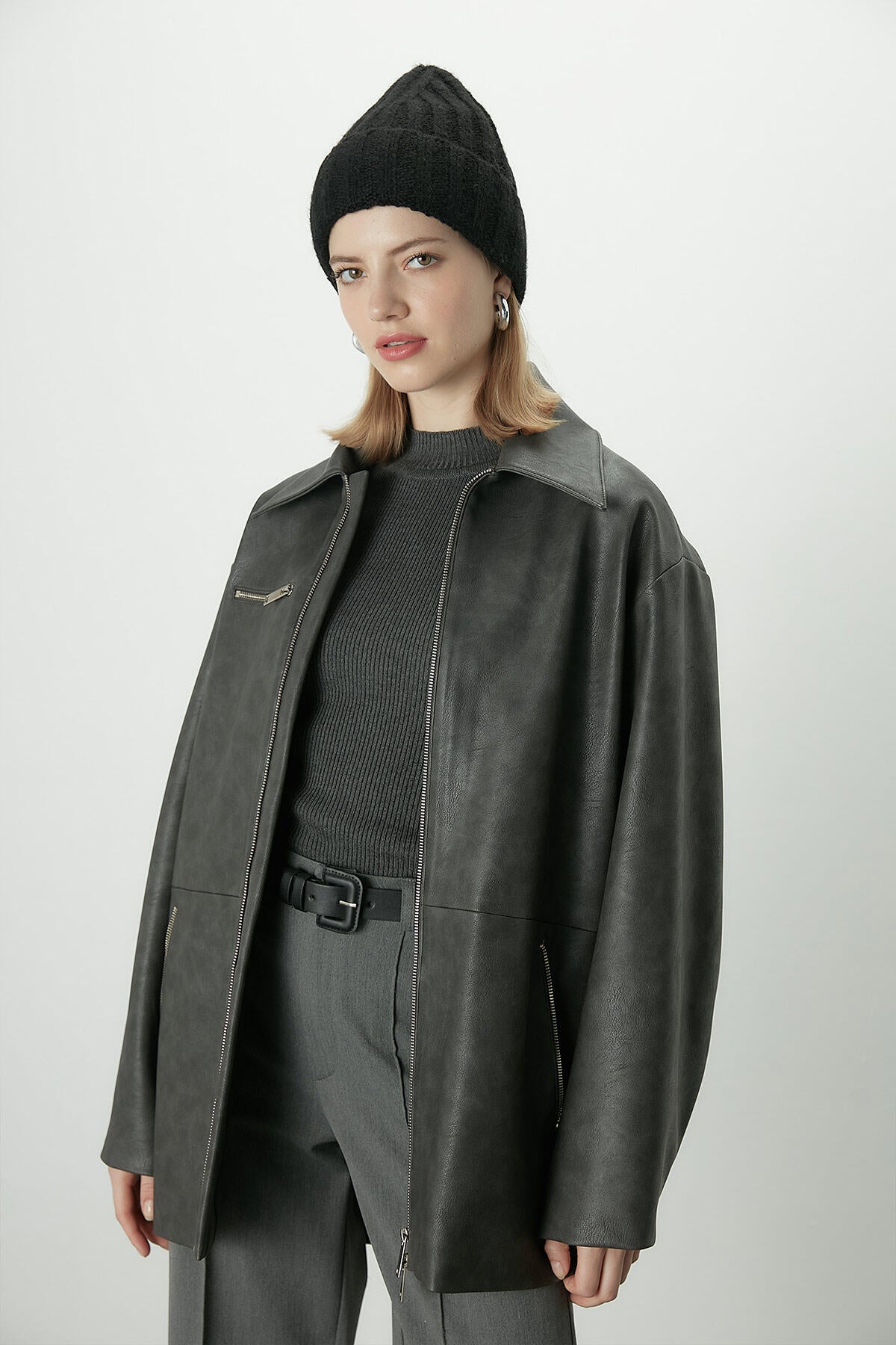 Crafted from high-quality faux leather, this jacket exudes the luxurious look and feel of genuine leather while remaining animal-friendly. The shirt collar adds a touch of sophistication, and the zip closure ensures a secure fit. With its lined interior, the jacket provides both warmth and comfort, making it suitable for year-round wear. The zippered pockets add a functional element, perfect for storing small essentials on the go. Designed with a vintage-inspired finish, this jacket offers a stylish and edgy look that will never go out of style.