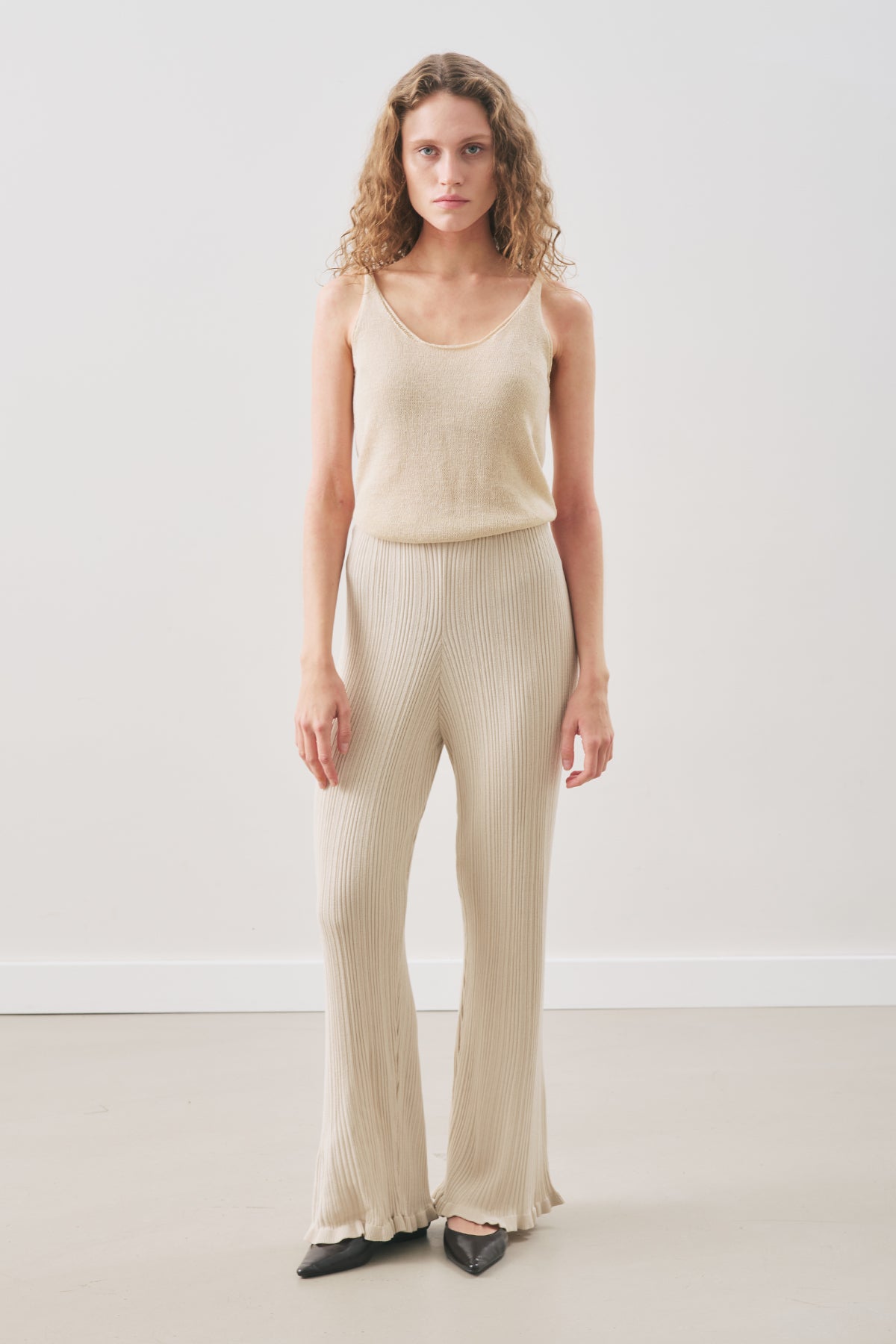 Ruffled Ribbed Knit Pants Beige