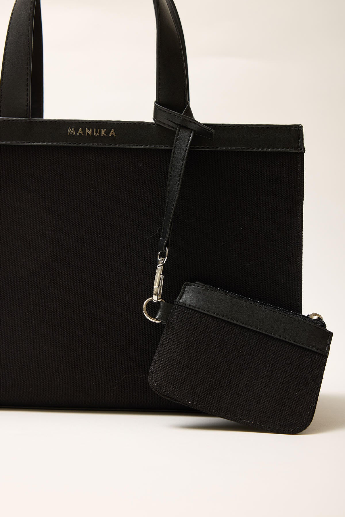 Crafted from durable canvas with leather accents, this bag is both practical and stylish. The wide design offers plenty of space to carry all your essentials, while the mini wallet detail adds a charming touch. The adjustable crossbody strap and additional top handle provide versatility in carrying options, allowing you to wear it comfortably on your shoulder or carry it by hand. Adorned with our signature Manuka logo, this bag exudes sophistication and elegance. The lined interior features a small pocket for keeping smaller items organized, while the snap button closure ensures the security of your belongings.