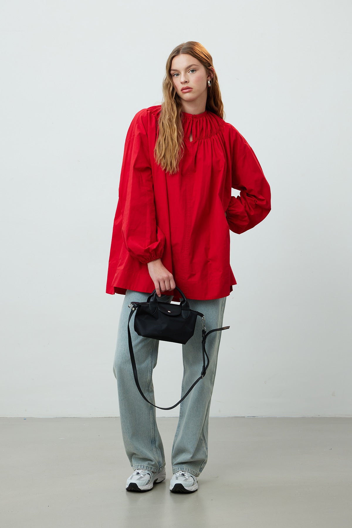 This tunic features a round neckline enhanced with an elastic shirred collar, providing a subtle gathered texture that adds depth and interest to the simple silhouette. The front button closure adds a touch of sophistication, allowing for easy wear and a hint of allure. Accompanied by a belt, this tunic offers versatility in styling, enabling you to cinch the waist for a more defined silhouette or wear it loose for a relaxed fit. Made from soft cotton fabric, it promises breathability and comfort, making it perfect for all-day wear.