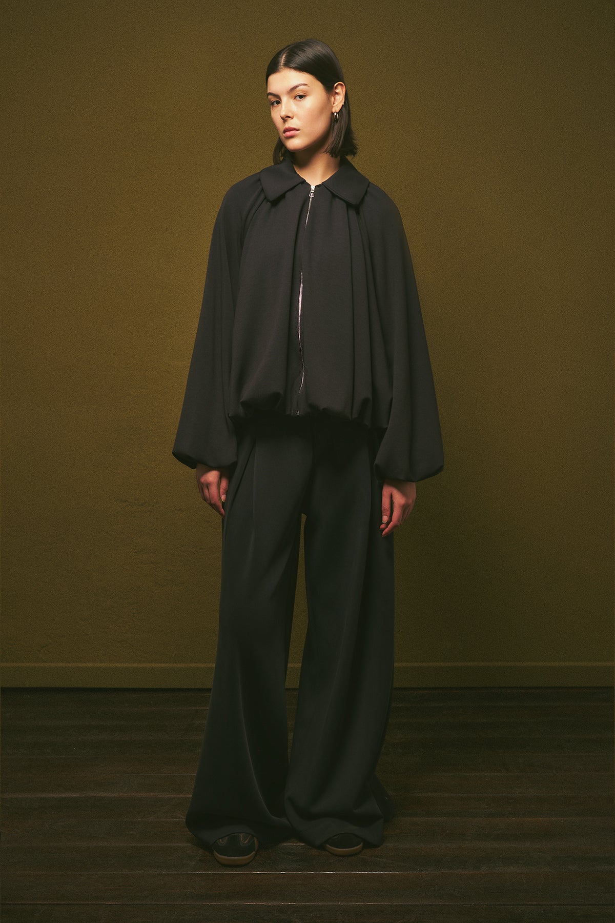Normal kalıp,gömlek yaka,reglan kol,büzgülü beden ve kollar,crop boy,fermuarlı kapama.
