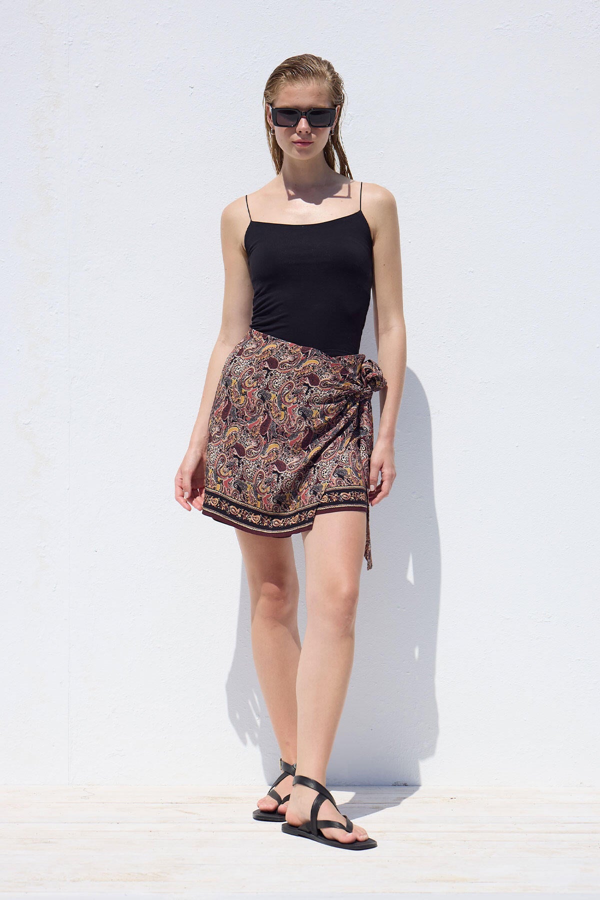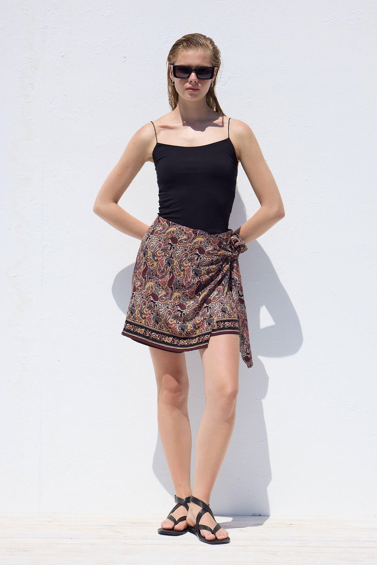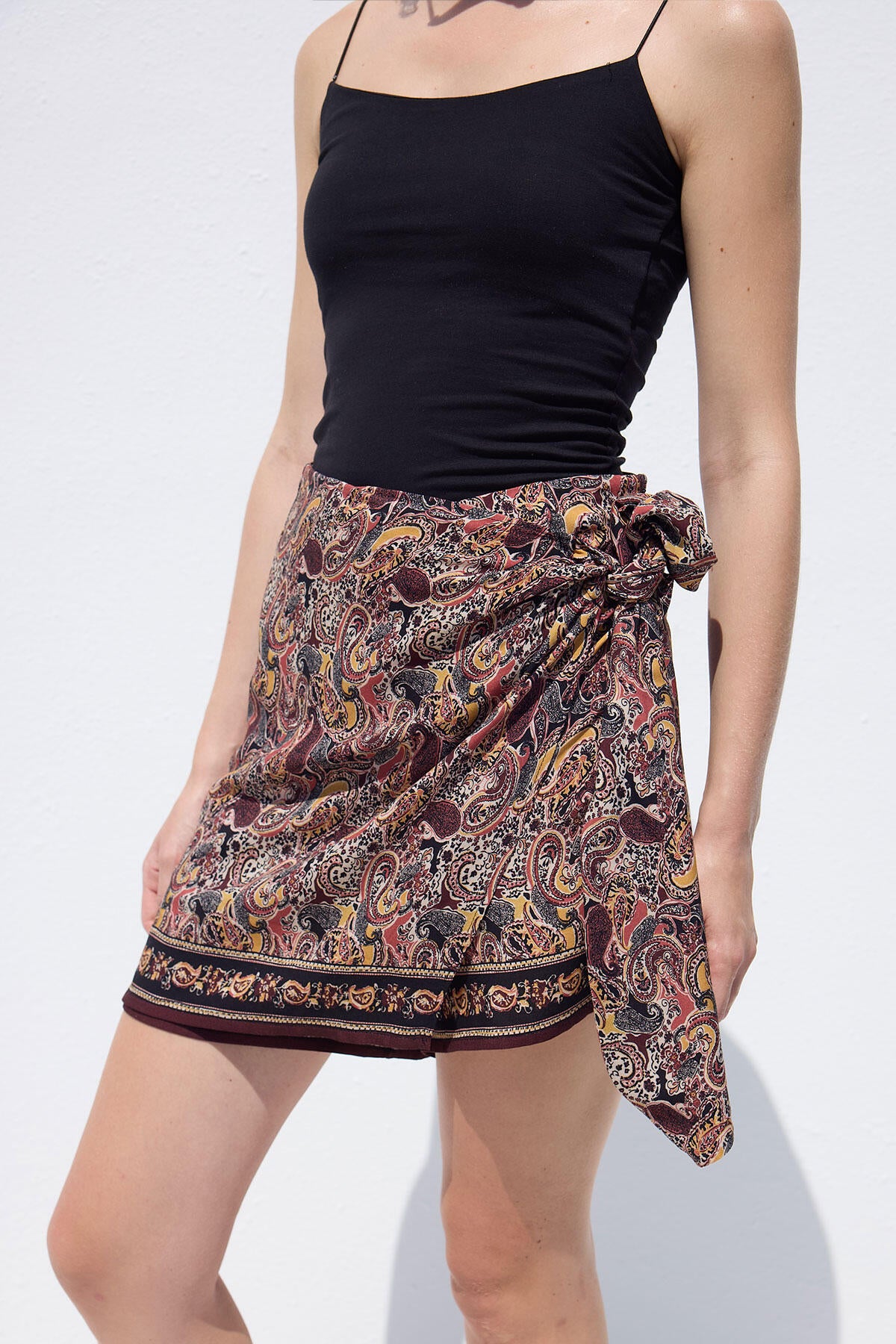 Önü etek, arkası şort görünümünde olan bu sarmal etek, yan fermuarlı ve bağcık detaylıdır. Desenli viskon kumaştan üretilmiştir.