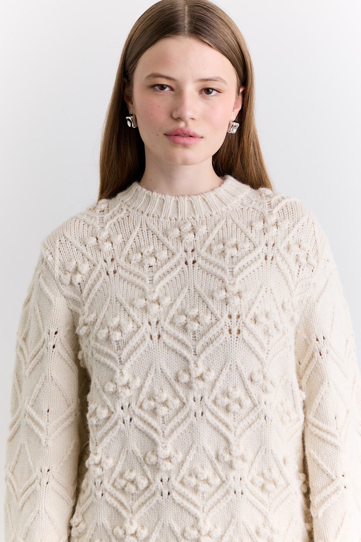 Normal kalıp, yuvarlak yaka, uzun kol, ajur örgülü kazak, ara boy.