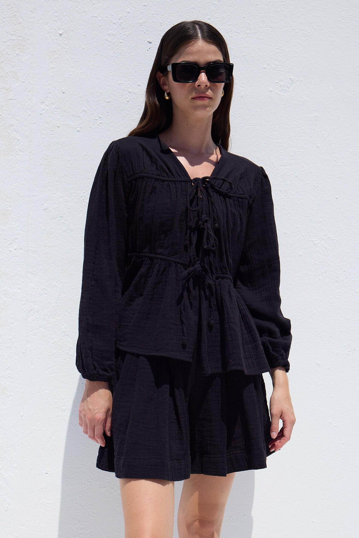 Bu dar kesim bluz, toplanmış detaylara, bağcıklı kapanışa ve uzun kollara sahiptir. Muslin kumaştan üretilmiştir.