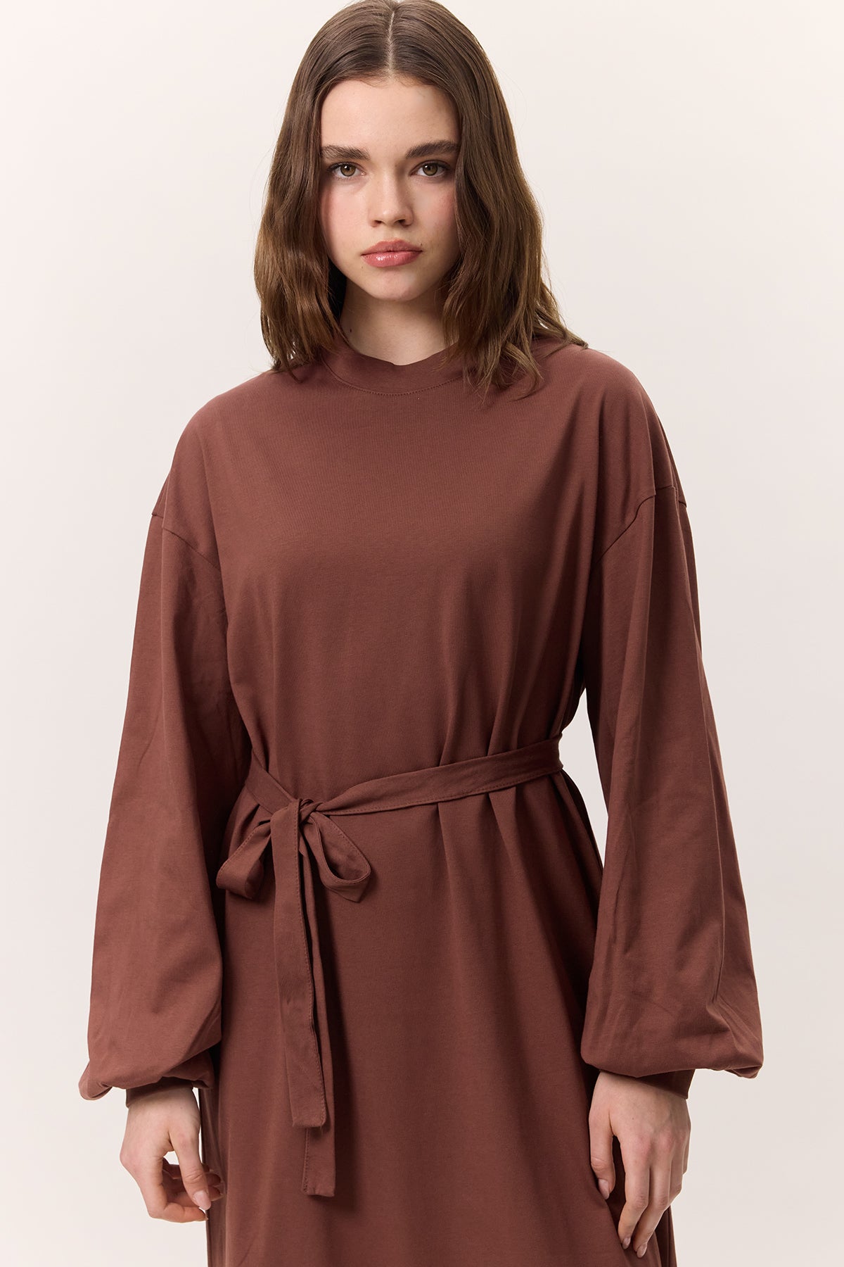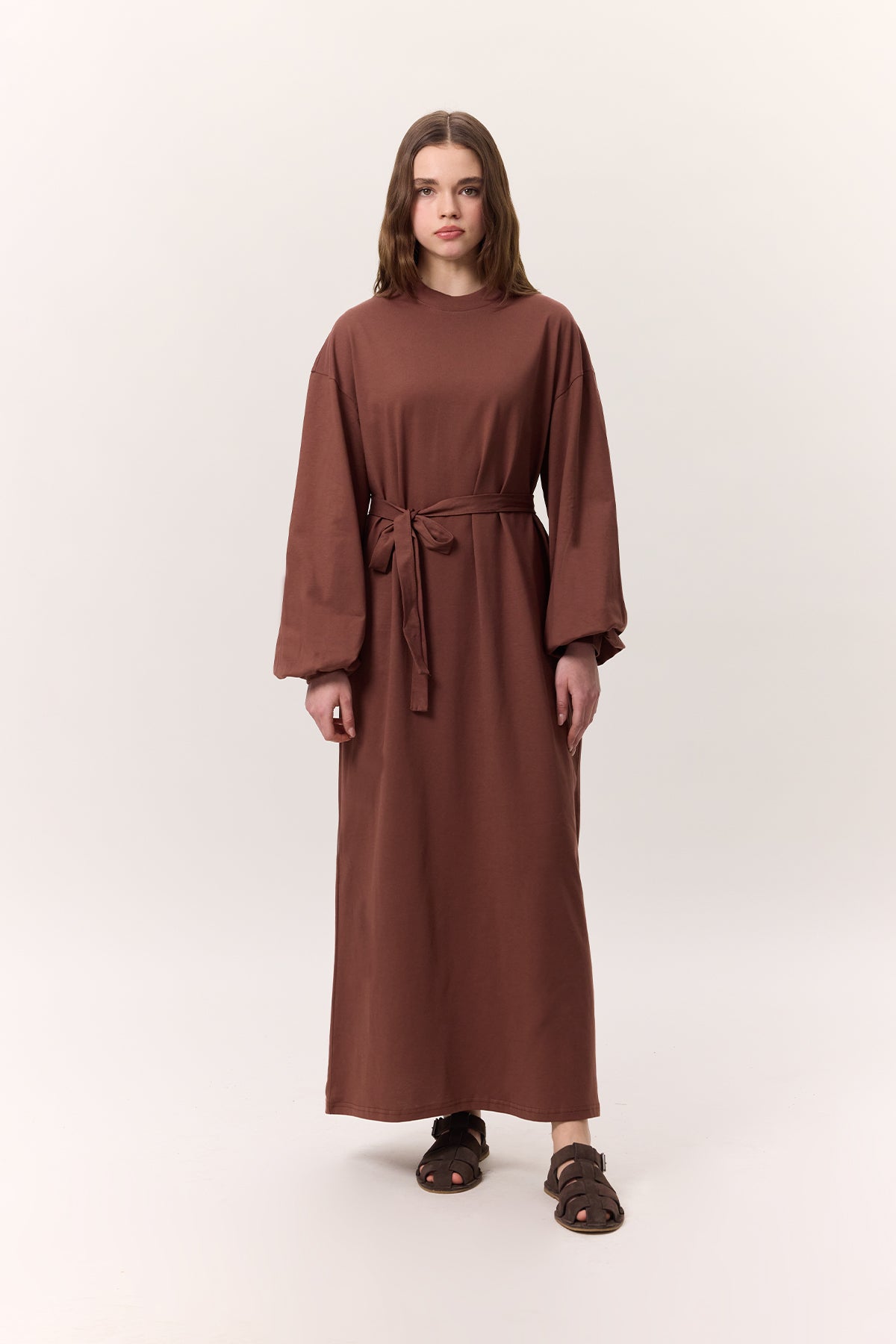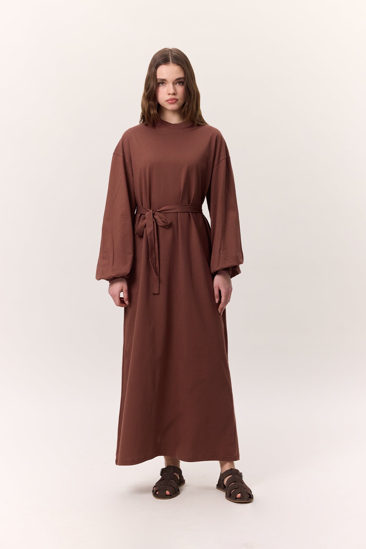 Balon Kollu Uzun Elbise Kabuk Kahverengi
