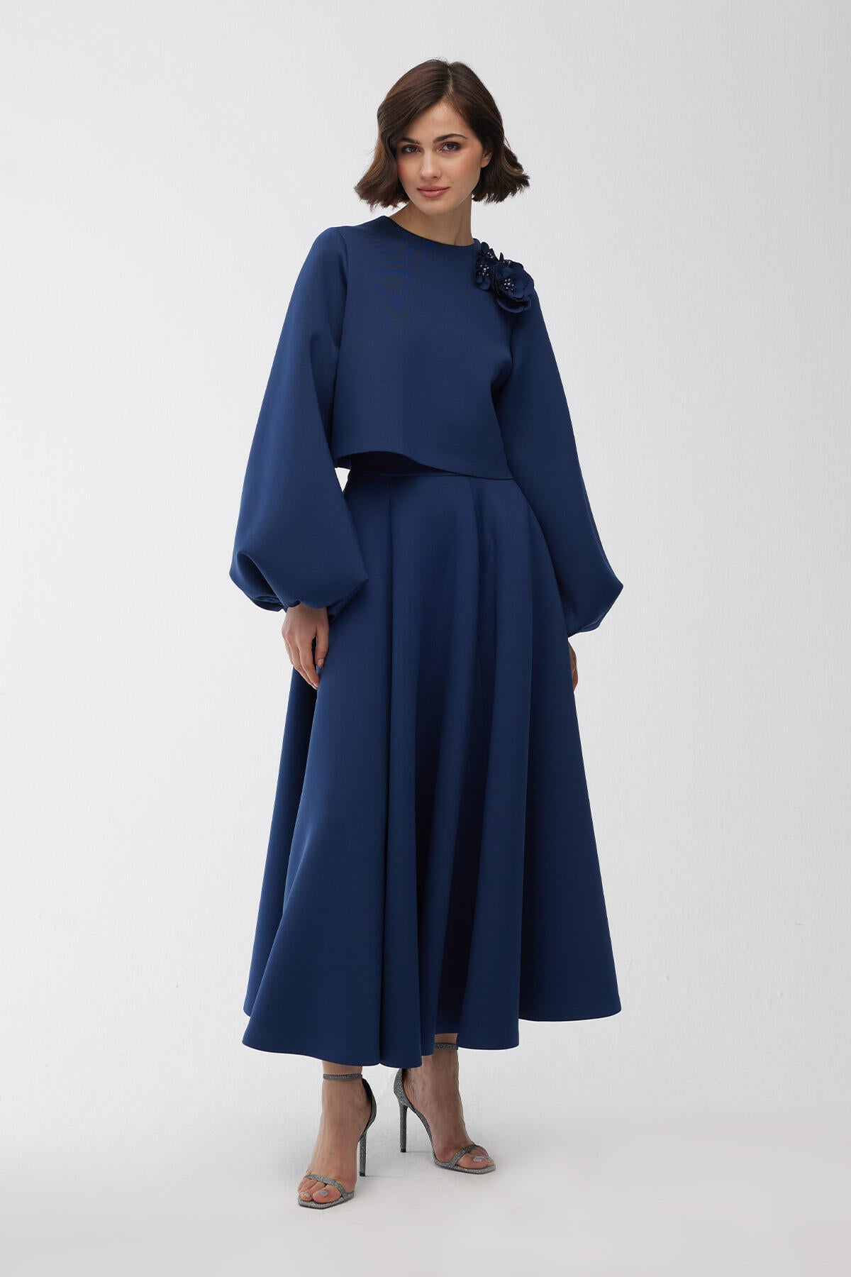 3D Çiçek Broşlu Puffer Scuba Kumaş Üst