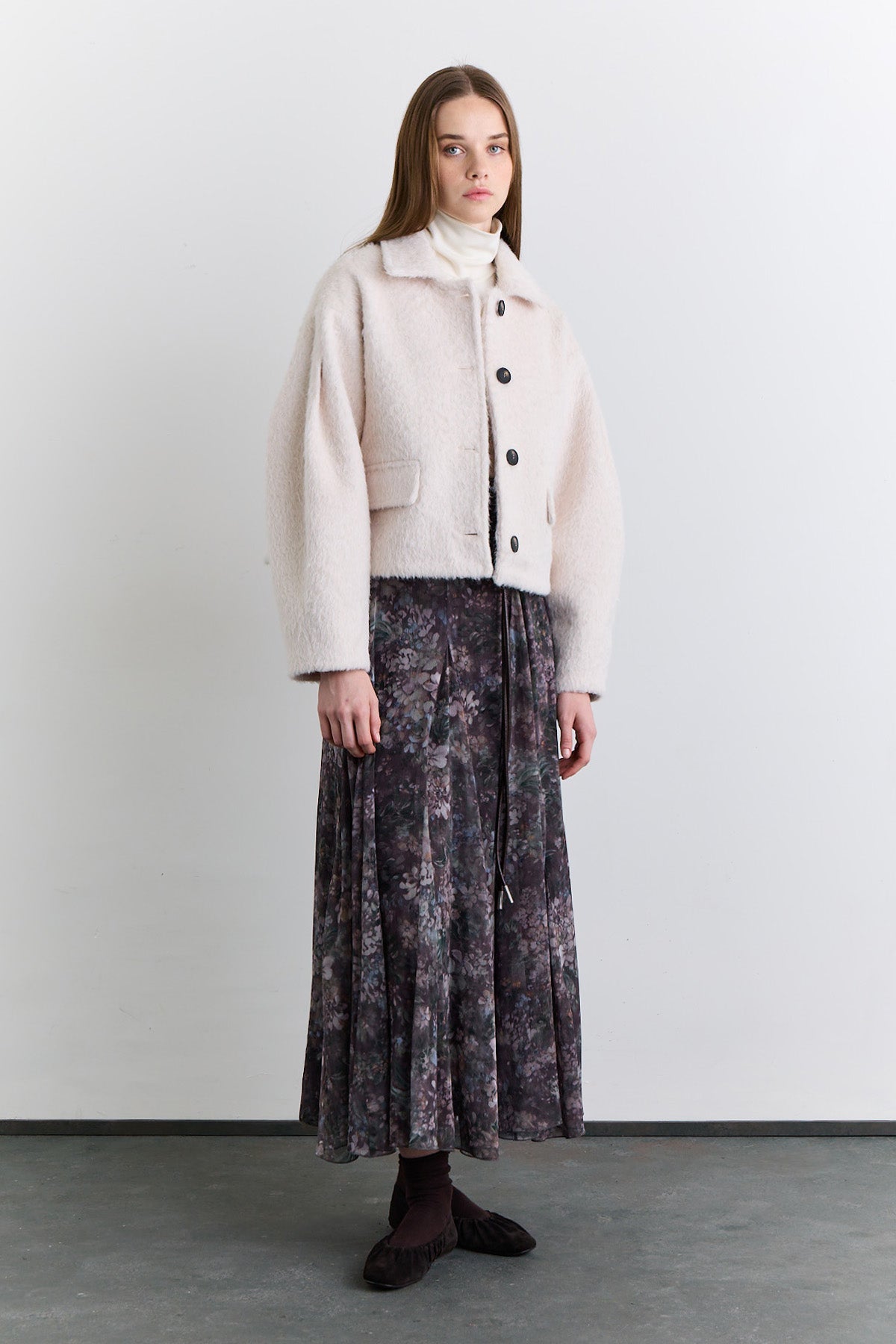 Kloş etek form, yüksek bel, çoklu desenli etek, fermuar kapamalı.