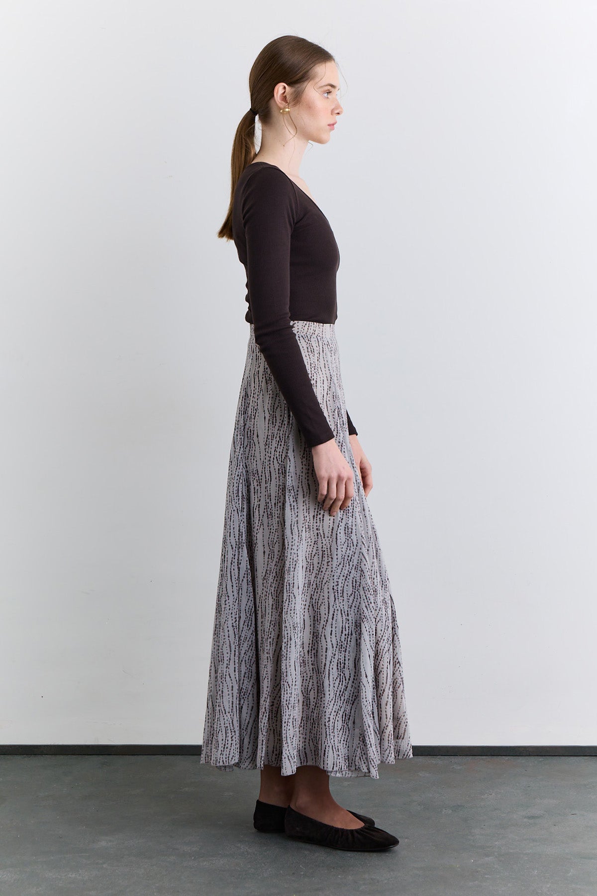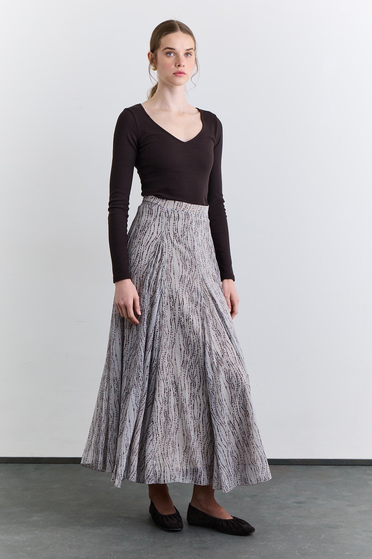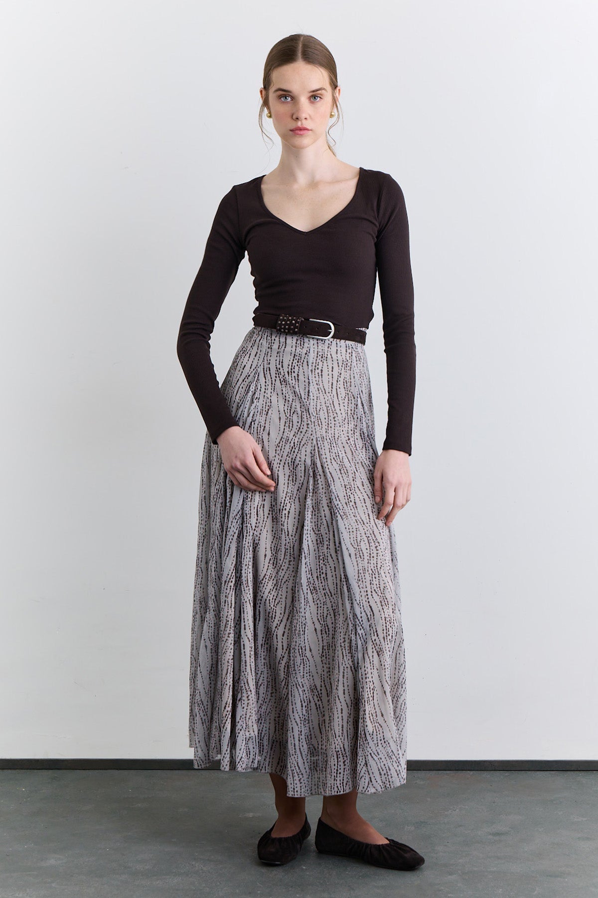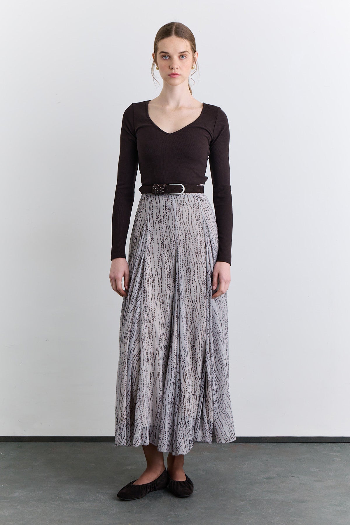 Kloş etek form, yüksek bel, çoklu desenli etek, fermuar kapamalı.