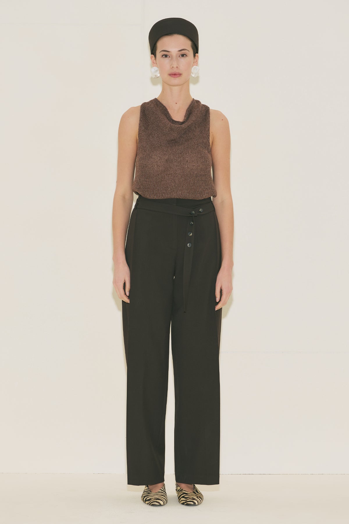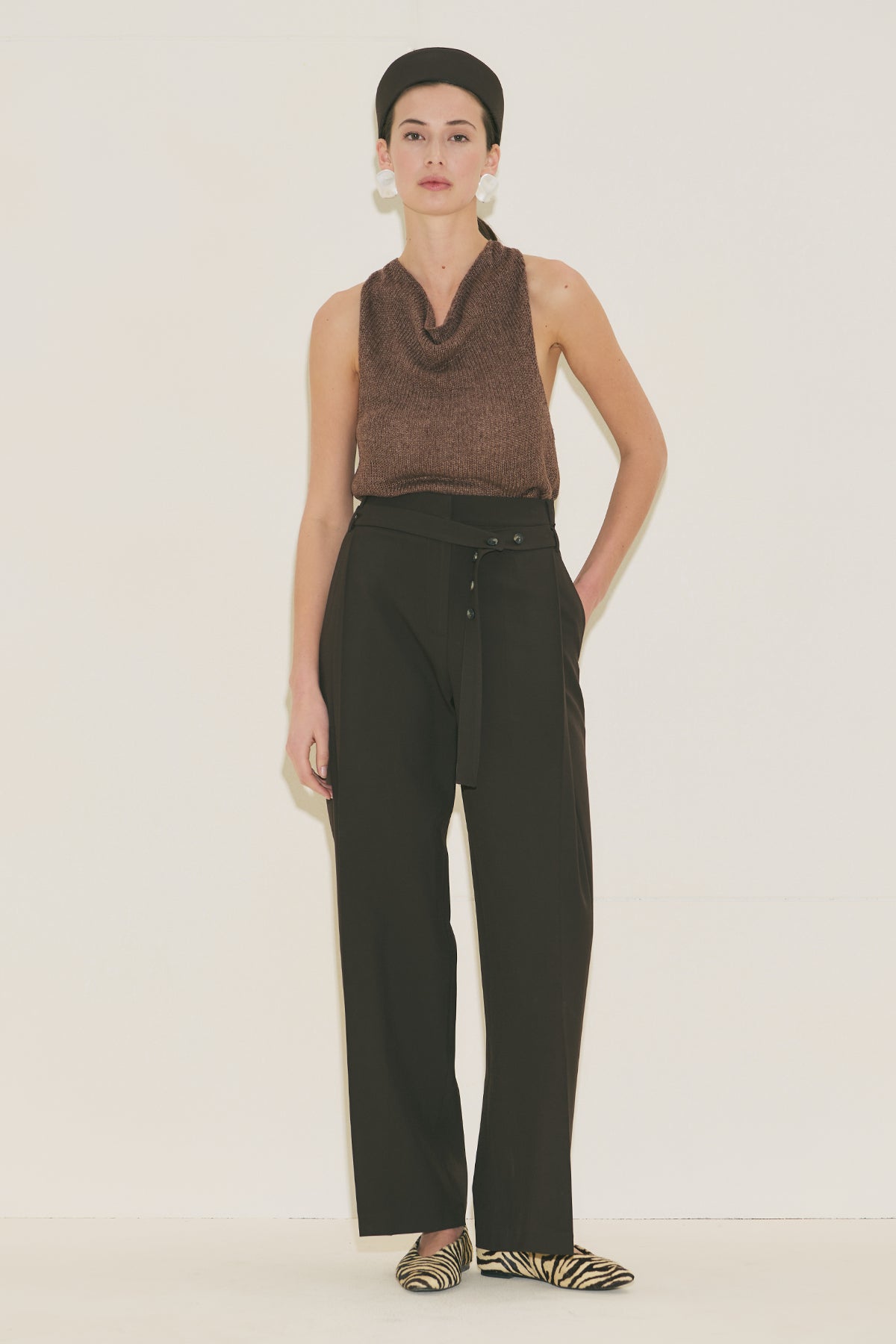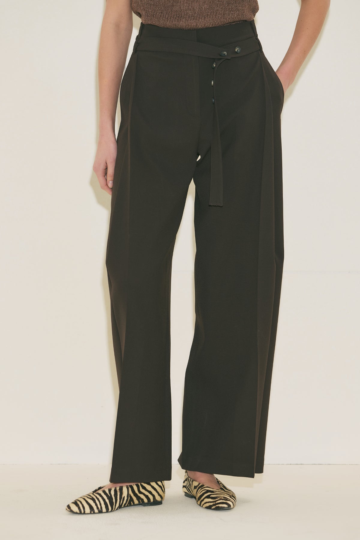 Belted Trousers With Wide Pleats Brown