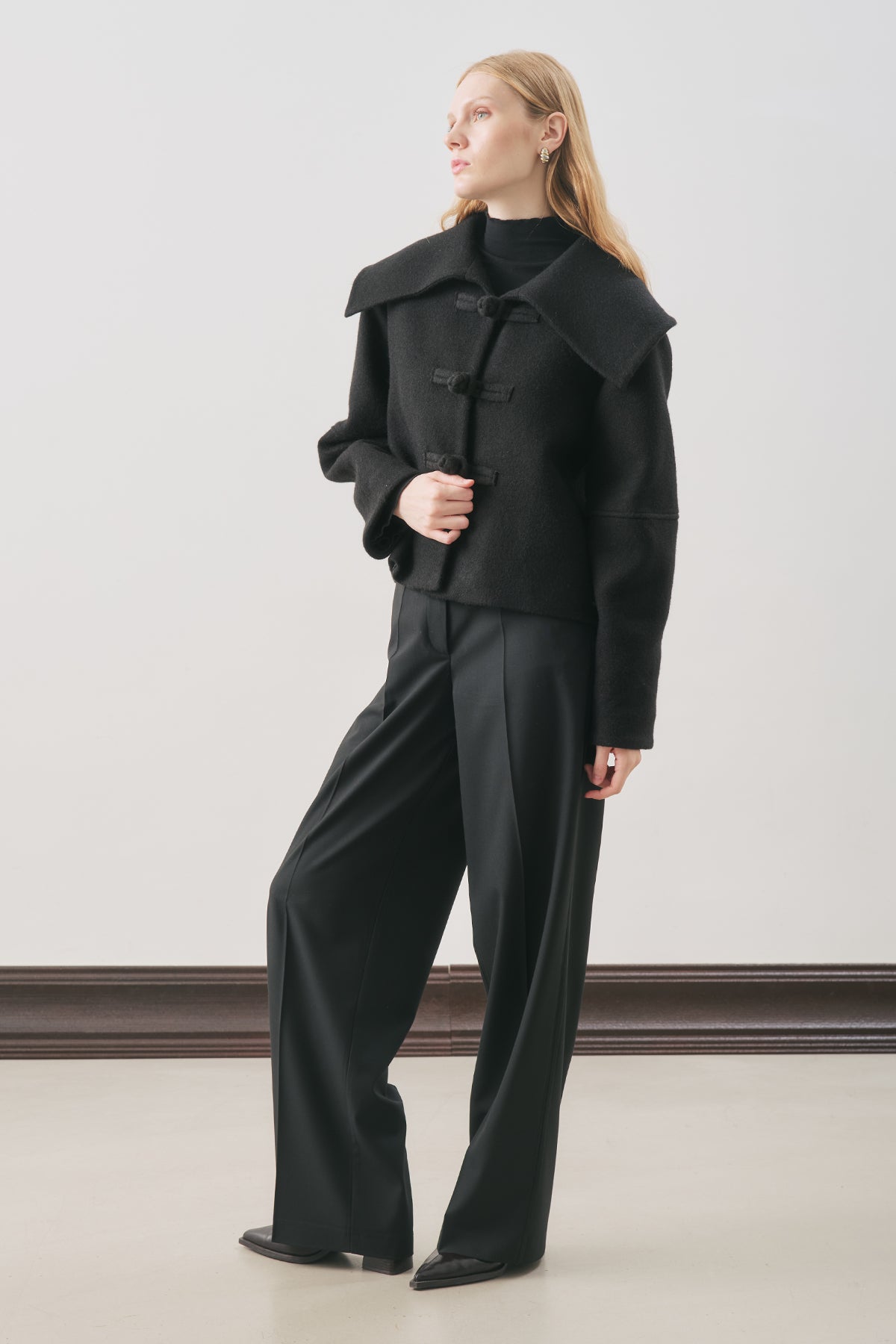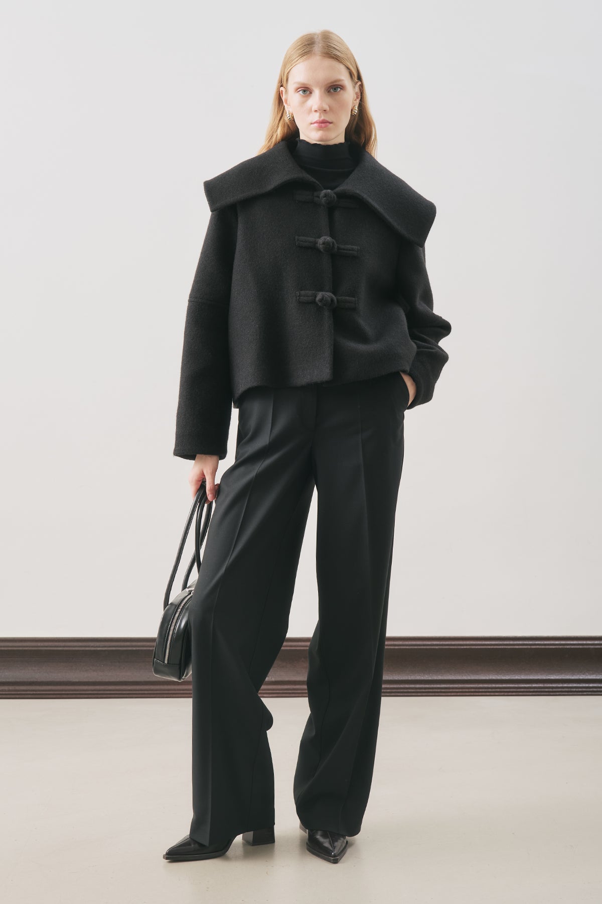 Normal kalıp,geniş yakalı,uzun kol,yaka ve düğme detaylı,crop boy,düğmeli kapama.