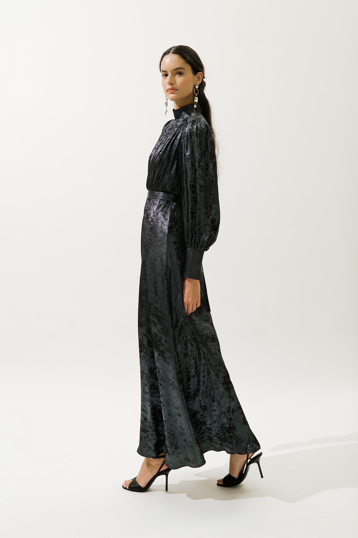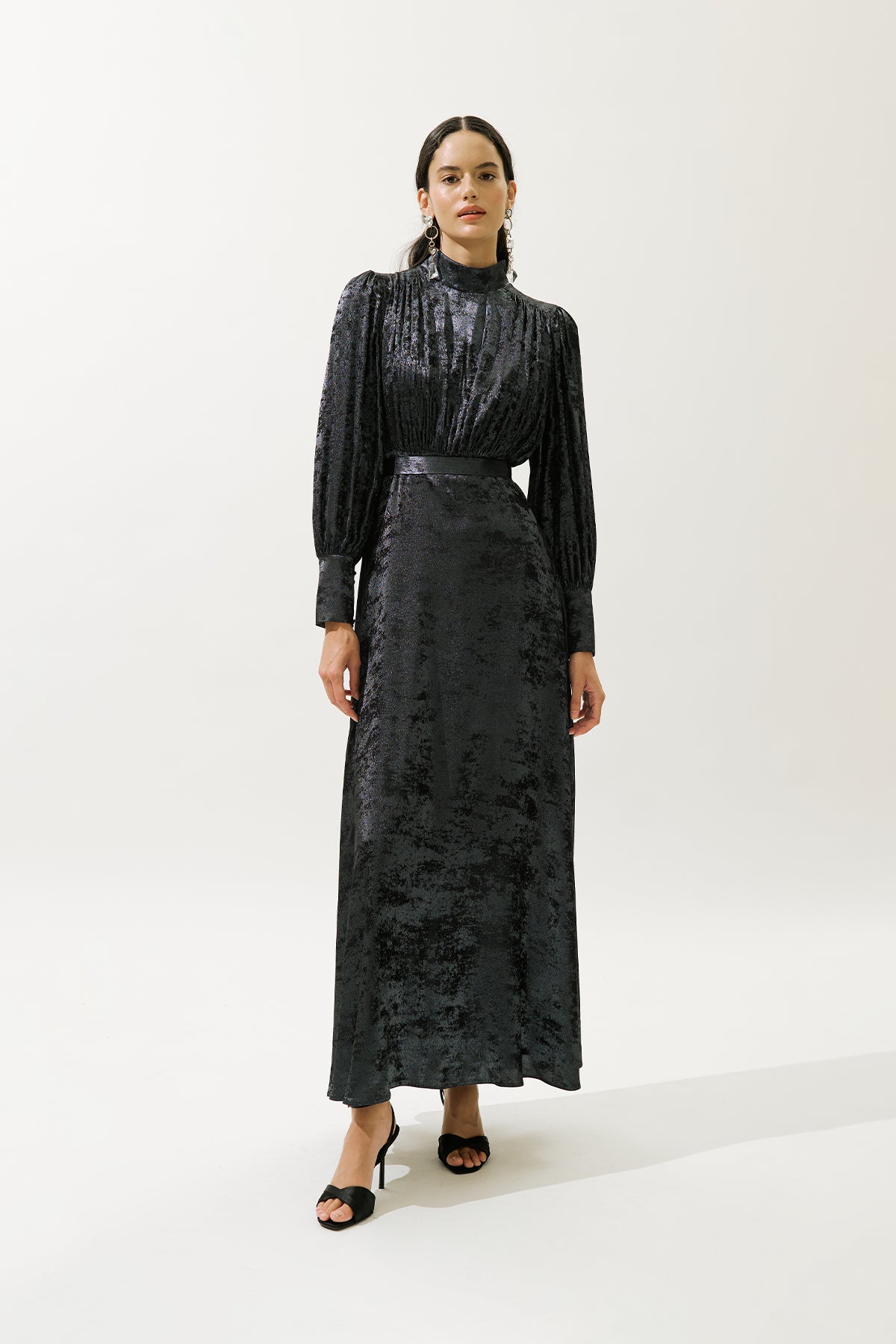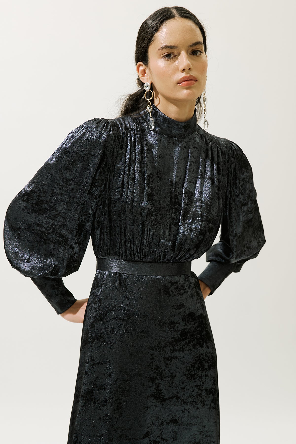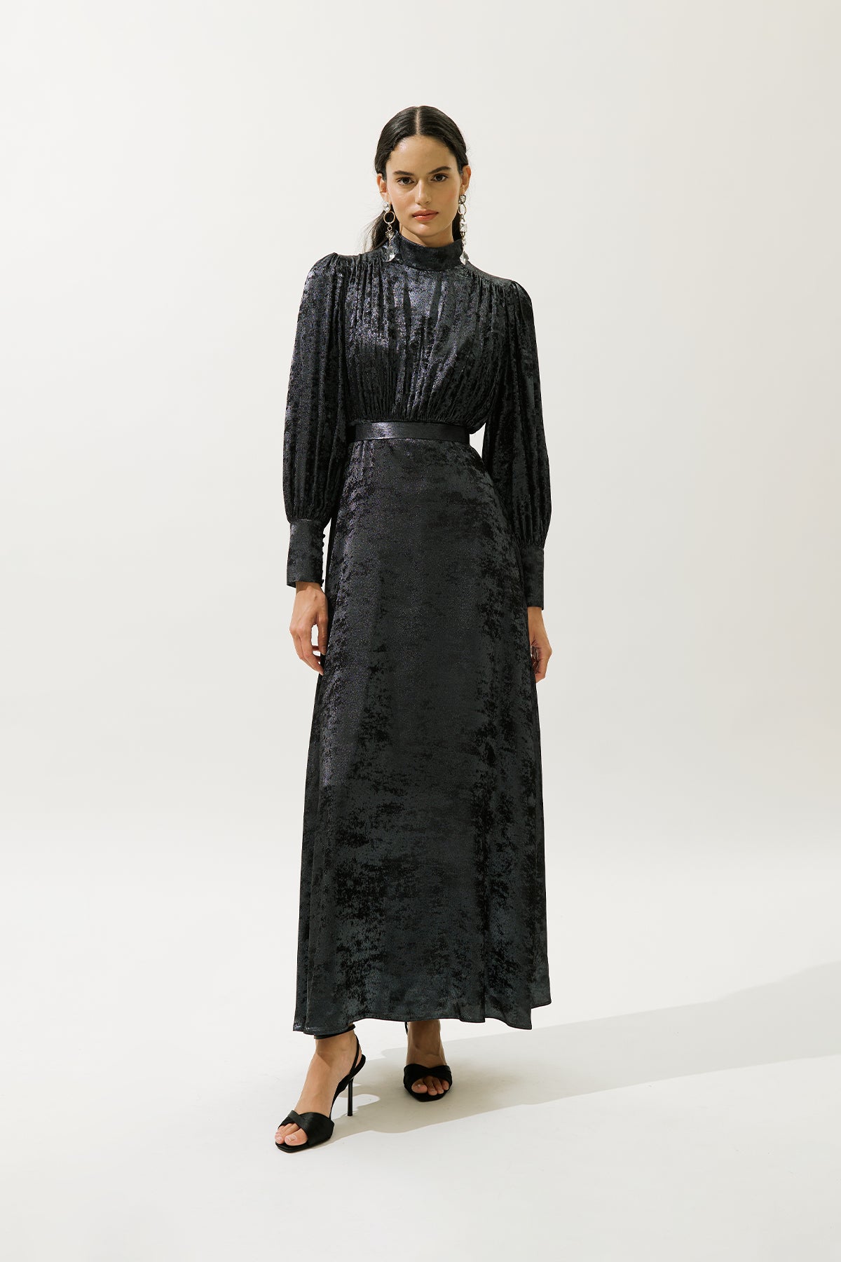 Yüksek yaka ve uzun balon kollara sahip, uzatılmış manşetler, bir miktar drama ve zarafet katıyor. Üst gövde, hem ön hem de arkada fırfırlı detaylarla süslenmiştir ve figürünüzü vurgulayan hoş bir silüet oluşturur. Rahatlık ve kusursuz bir görünüm için tamamen astarlı olan bu elbise, normal bir kesimde tasarlanmıştır ve çeşitli vücut tiplerinde güzelce örtülmesini sağlar. Gizli fermuar kapatma, pürüzsüz, kesintisiz bir bitiş sağlar.