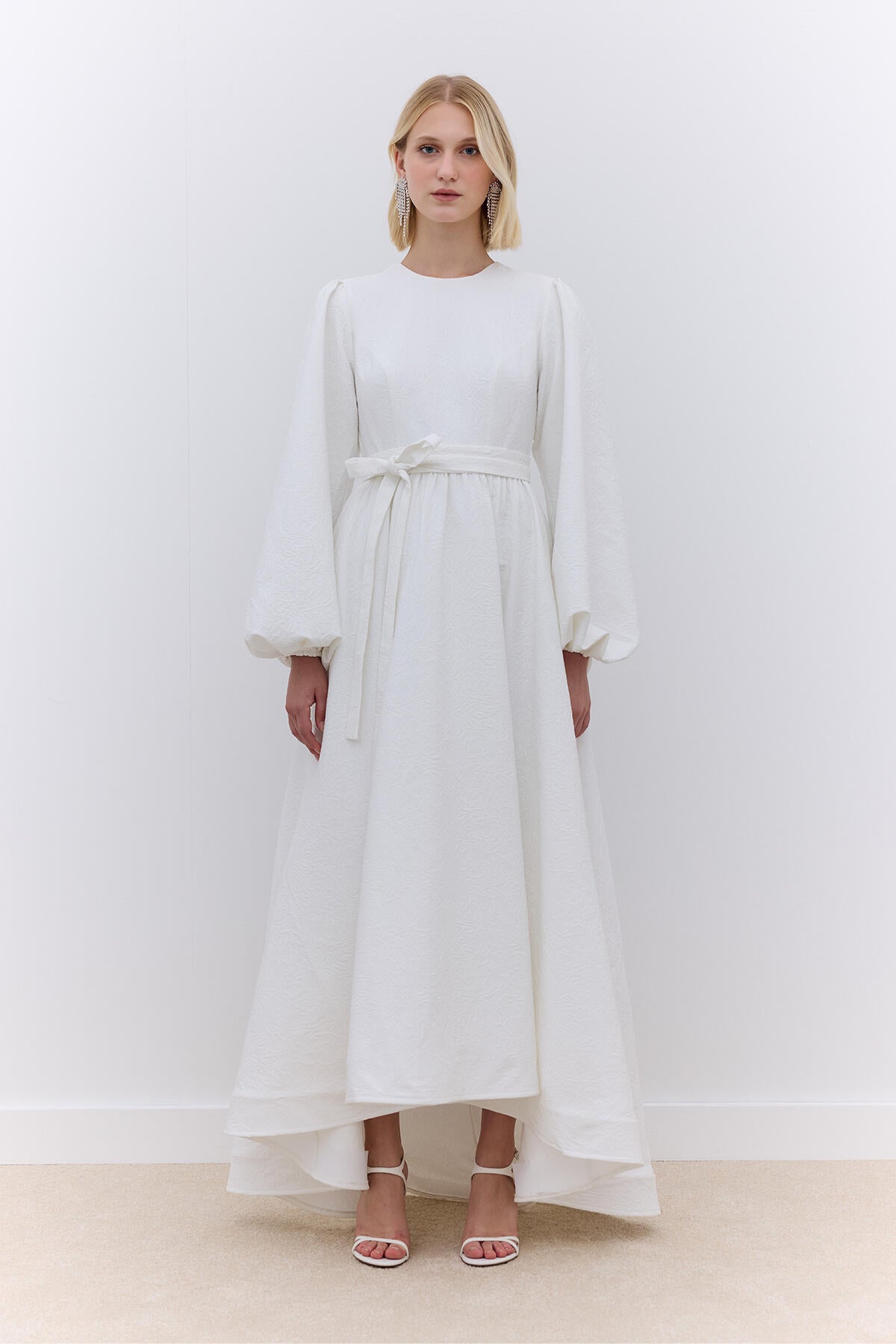Bu elbise balon kollara, yüksek-alçak etek ucuna ve geniş, hacimli bir eteğe sahiptir. Bel ve kollarda toplanmış detaylar, kemer detayı, elastik manşetler ve gizli arka fermuar kapatmasıyla jakarlı kabartmalı kumaştan üretilmiştir. Elbise tamamen astarlıdır.