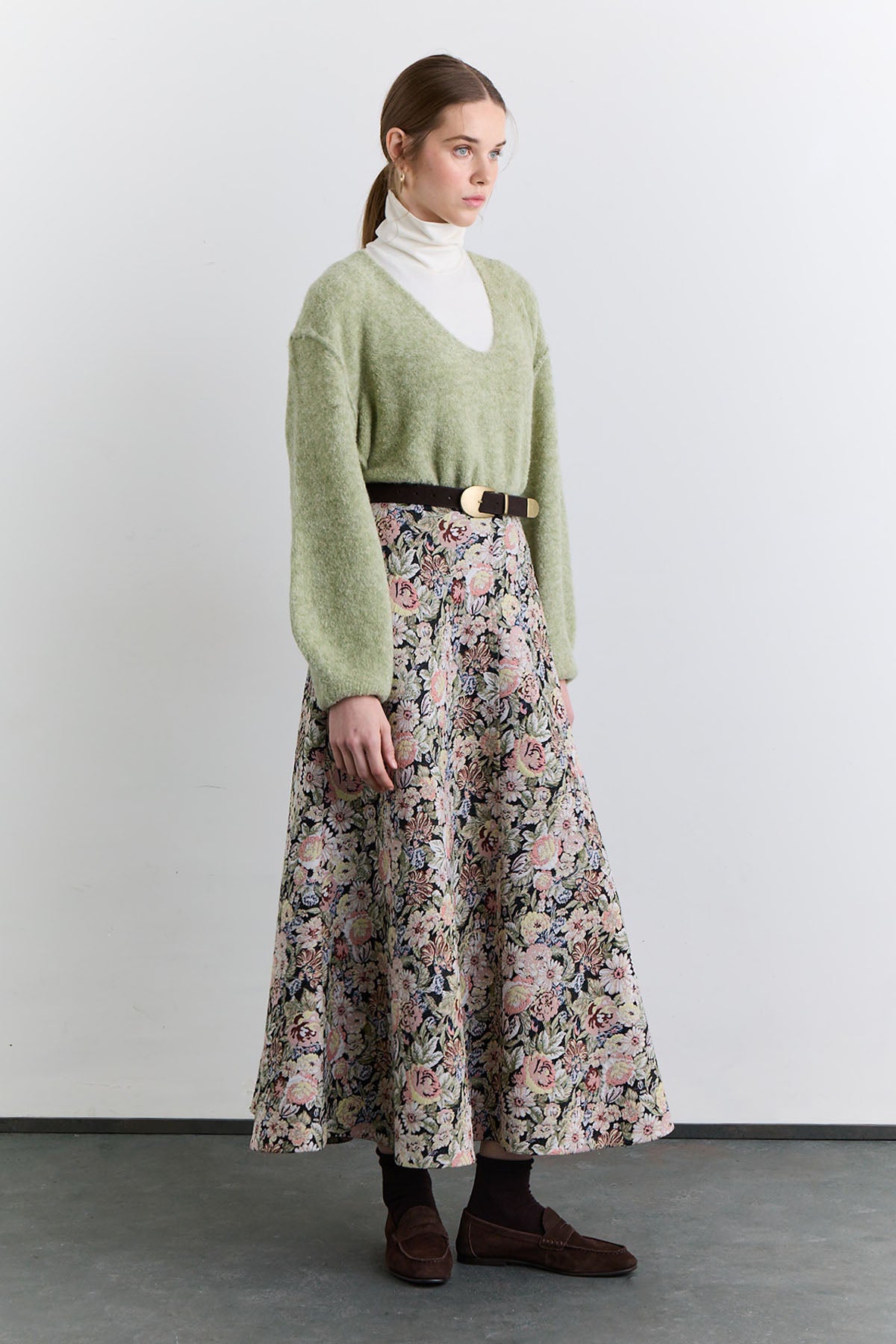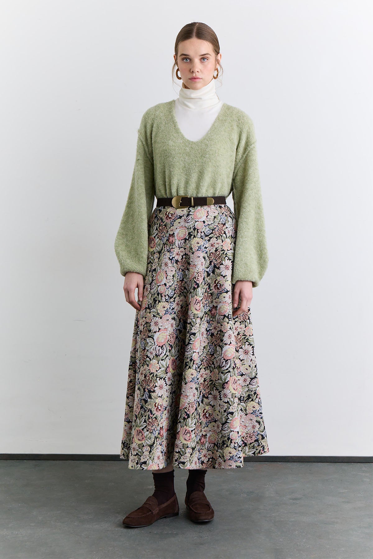 Normal kalıp, yüksek bel, desenli volanlı etek, tam boy, fermuar kapamalı.
