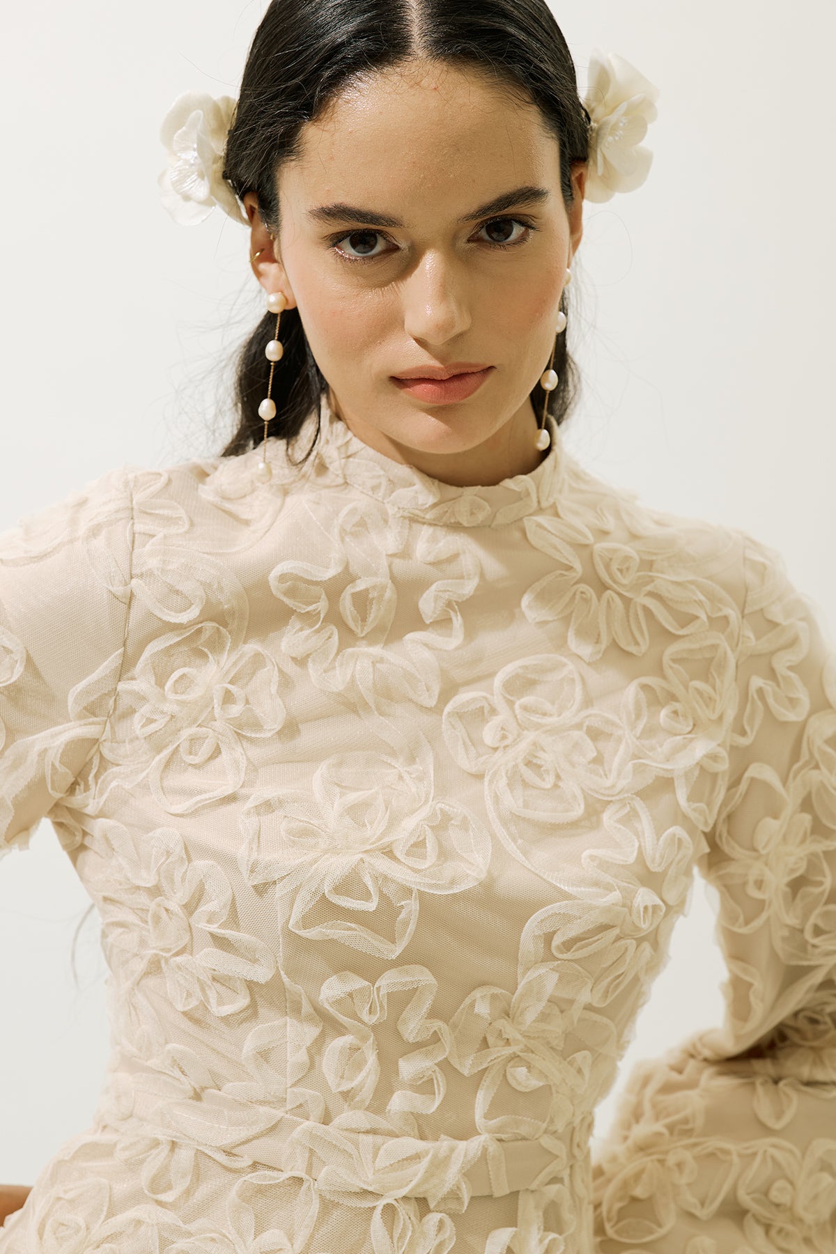 Uzun Kollu Çiçekli Hacimli Elbise İnci