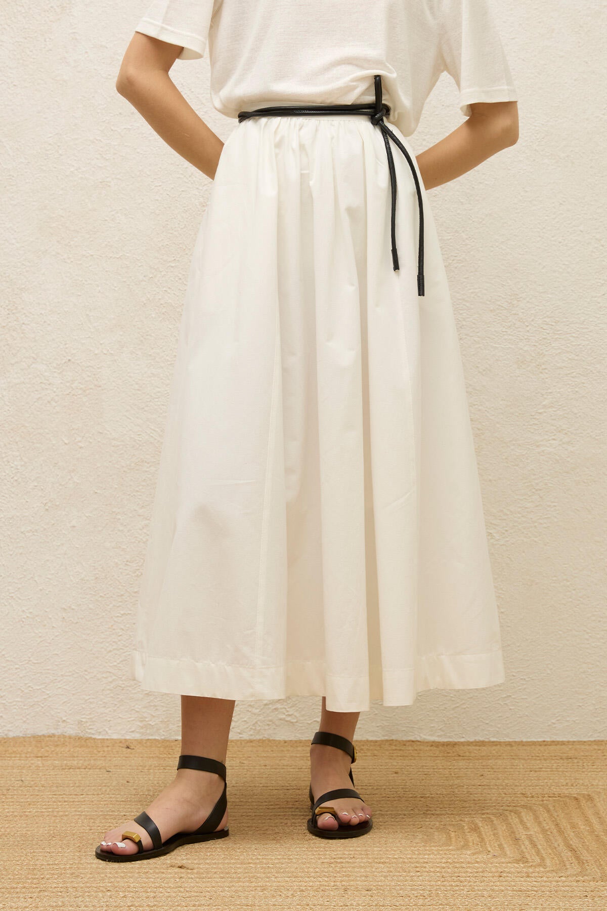 Rahatlık zarafetle buluşuyor. Bu etek belden tam oturacak şekilde tasarlanmıştır ve kusursuz bir görünüm için gizli fermuarlı bir kapatmaya sahiptir. Büzgülü detaylar ve benzersiz dikişler bir miktar sofistikelik katarken, pamuklu gabardin kumaş dayanıklılık ve rahatlık sağlar. Şık sadeliği temsil eden çok yönlü bir parça.