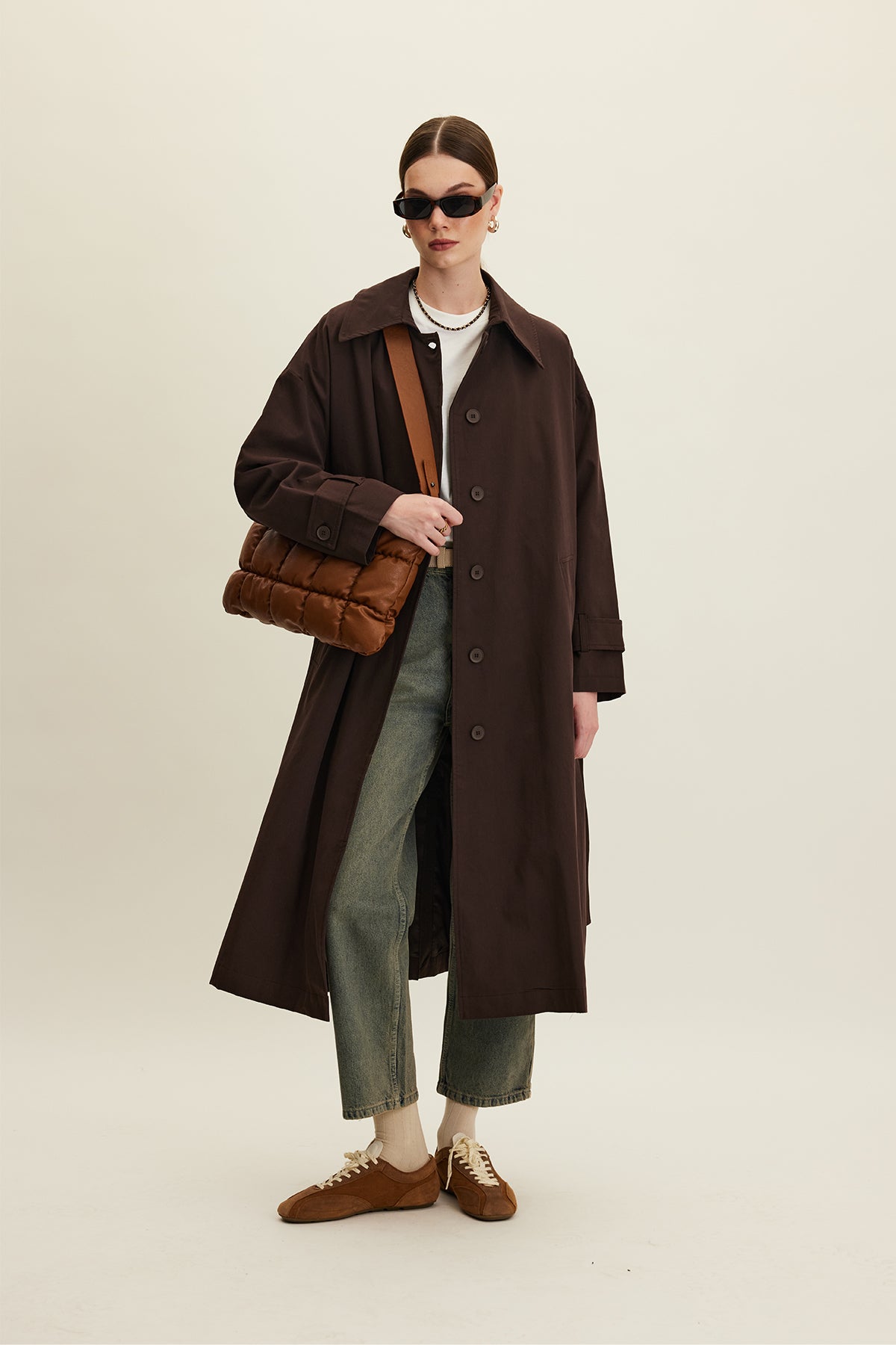 Büyük Boy Kemerli Gabardin Trençkot Koyu Kahverengi
