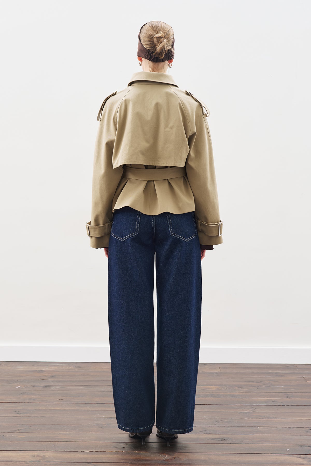 Ceket yakalı, uzun kollu, crop boy, kuşak detaylı, kruvaze kapamalı, normal kalıp, dokuma kumaş.