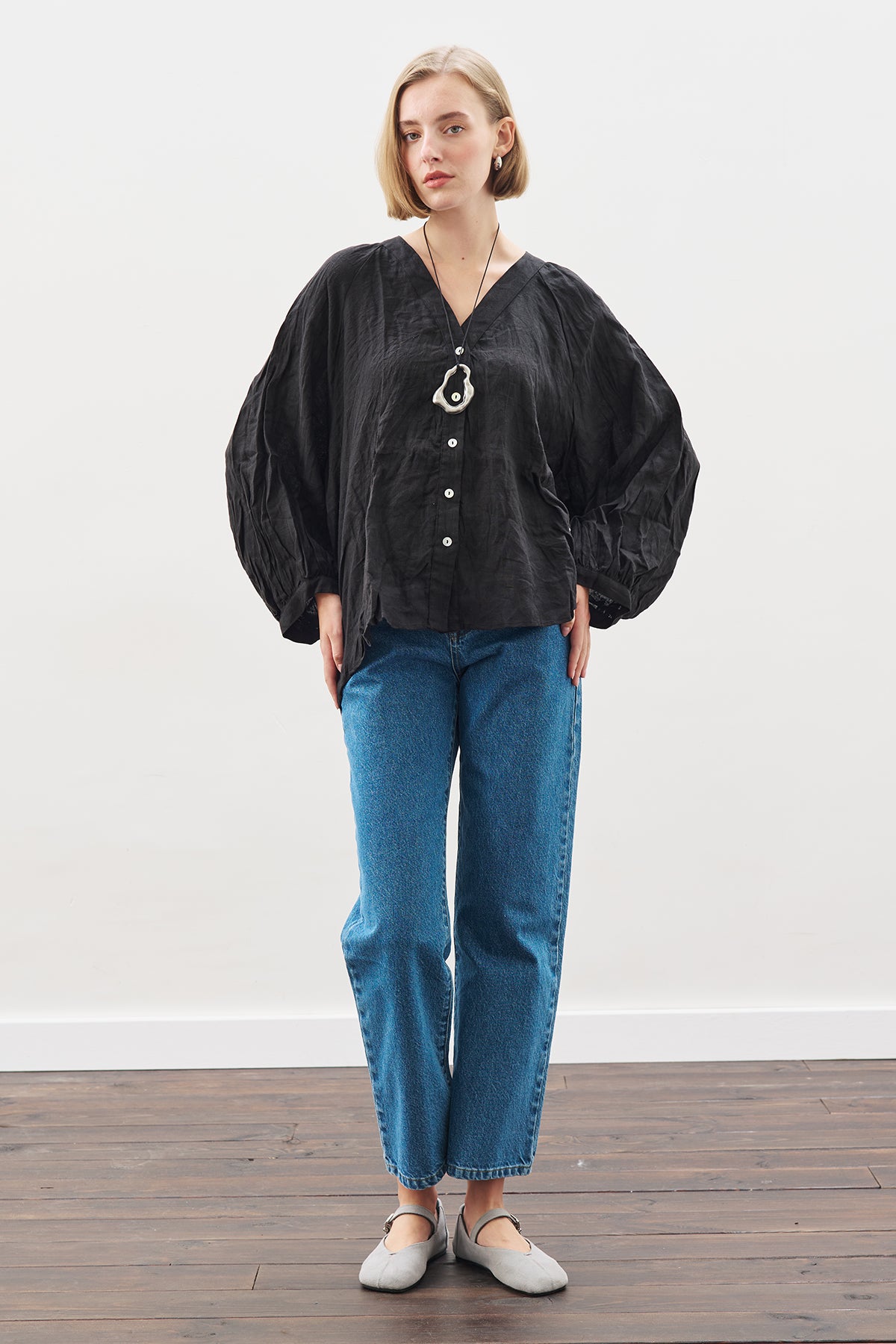 Normal kalıp, V yakalı, uzun kol, ara boy, düğme kapamalı, dokuma, büzgülü krushli bluz. Yalnızca elde soğuk suyla yıkayınız.