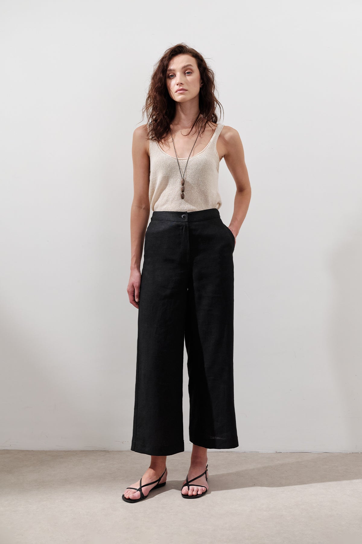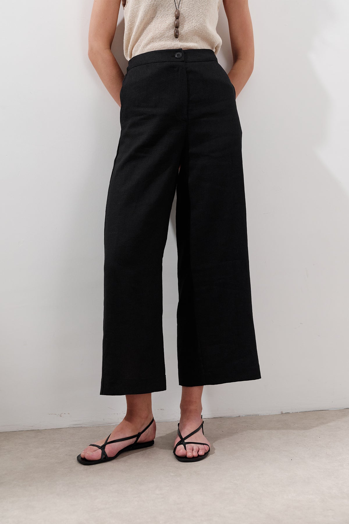Geniş Paça Keten Pantolon Siyah