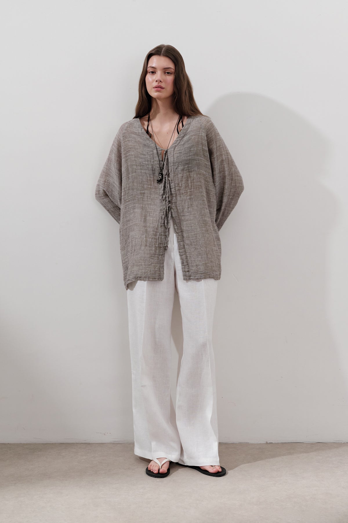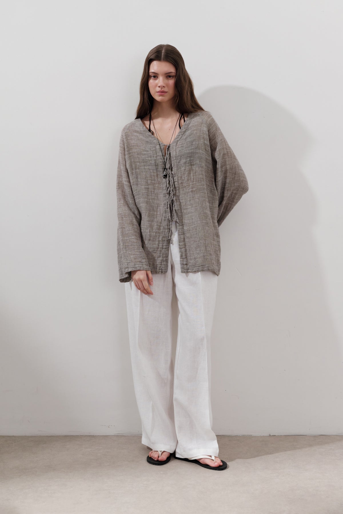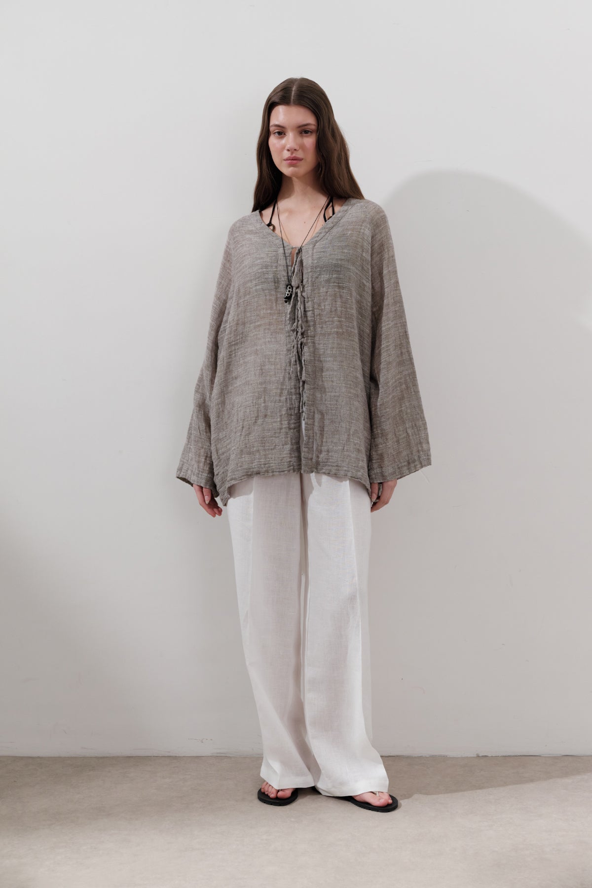 Önü Bağcıklı Keten Karışımlı Bluz Kahverengi