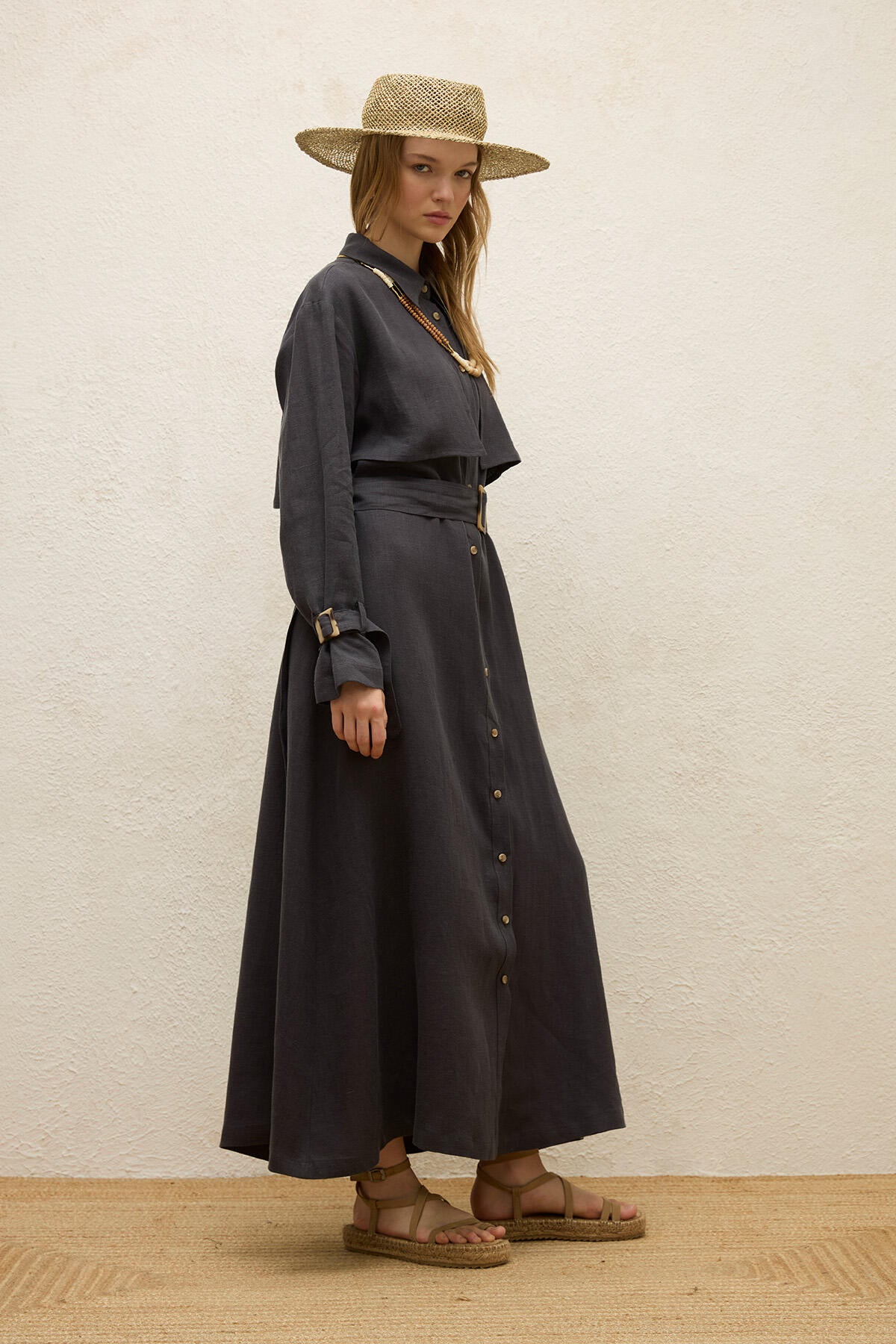 Keten Trençkot Tarzı Elbise Antrasit
