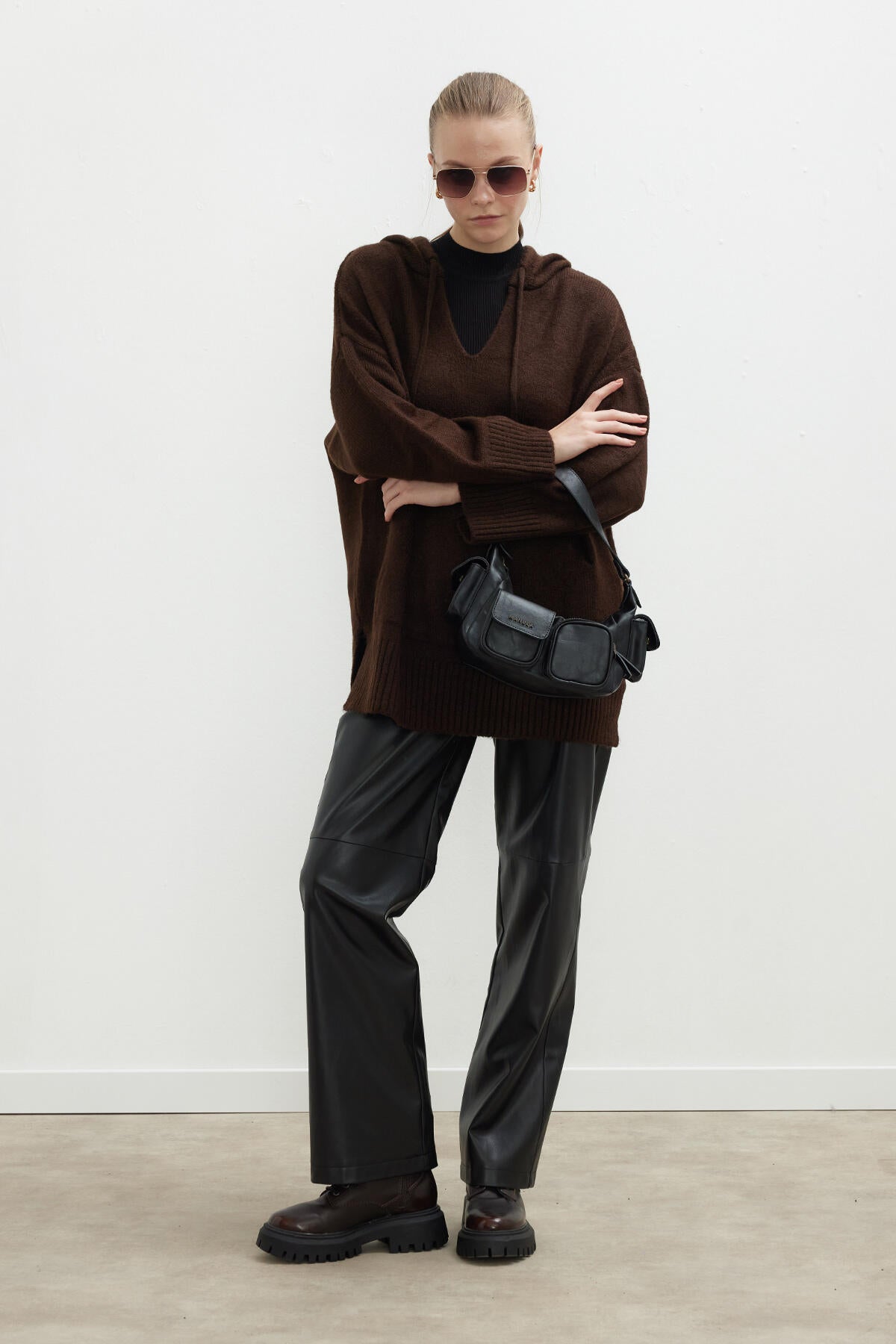 Lüks ve konforun en üst düzey ifadesi. Bu yüksek belli pantolon, şık ve kusursuz bir uyum sağlayan gizli bir yan fermuarla tasarlanmıştır. Palazzo stili ve geniş paça silüeti, klasik zarafete modern bir dokunuş sunarken, yan cepler pratiklik katar. Elastik arka bel, stilden ödün vermeden konfor sağlar. Yüksek kaliteli suni deriden üretilen bu pantolon, öne çıkmaya cesaret edenler için cesur bir seçimdir.