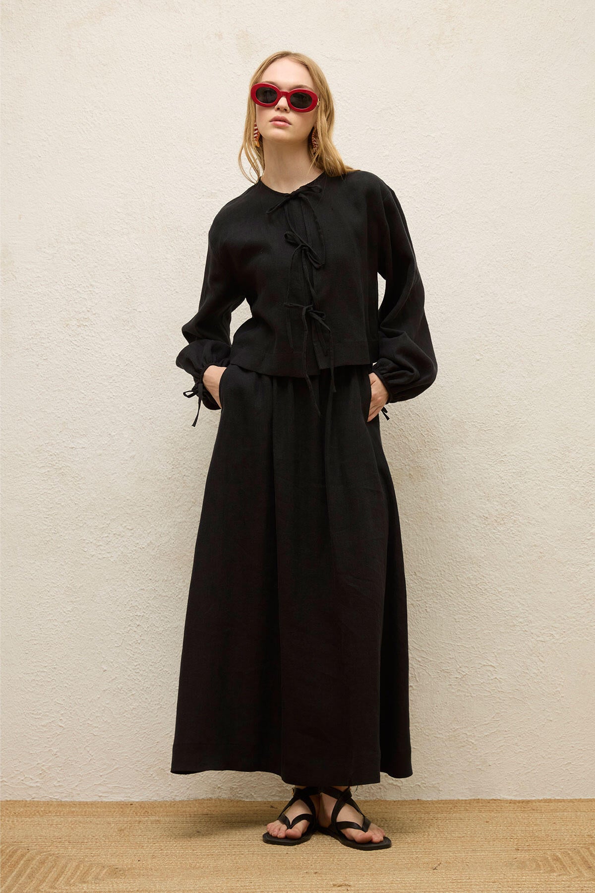 Keten Bağcıklı Bluz Siyah