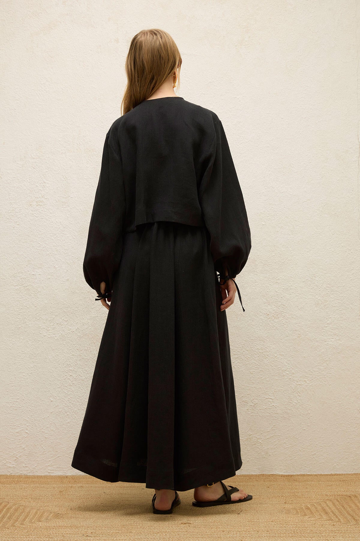 Bu üst yuvarlak yakalı, bağcıklı ve balon kolludur. %100 keten kumaştan üretilmiştir.