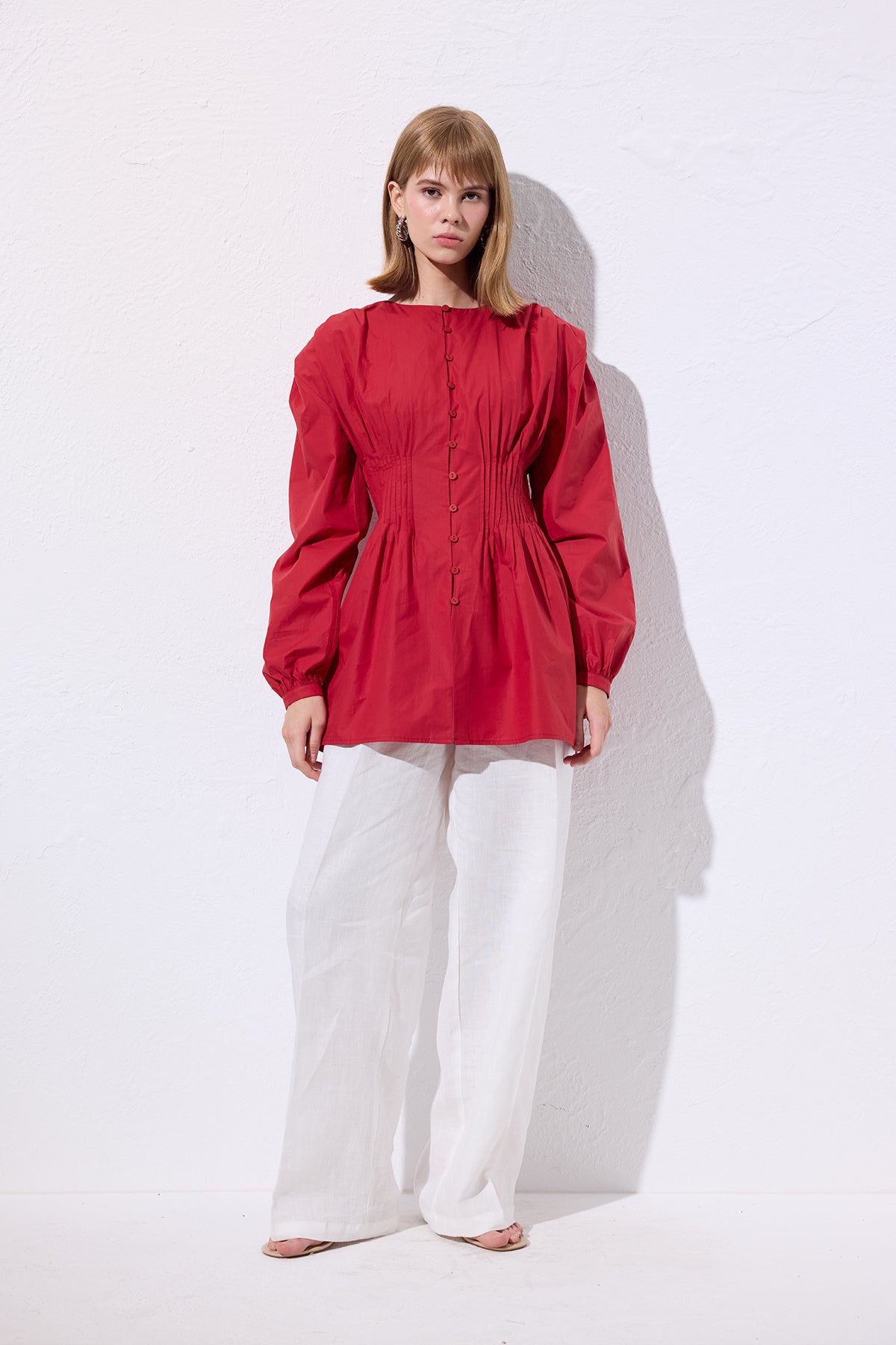 BELİ PİLE DETAYLI UZUN KOL BLUZ KIRMIZI