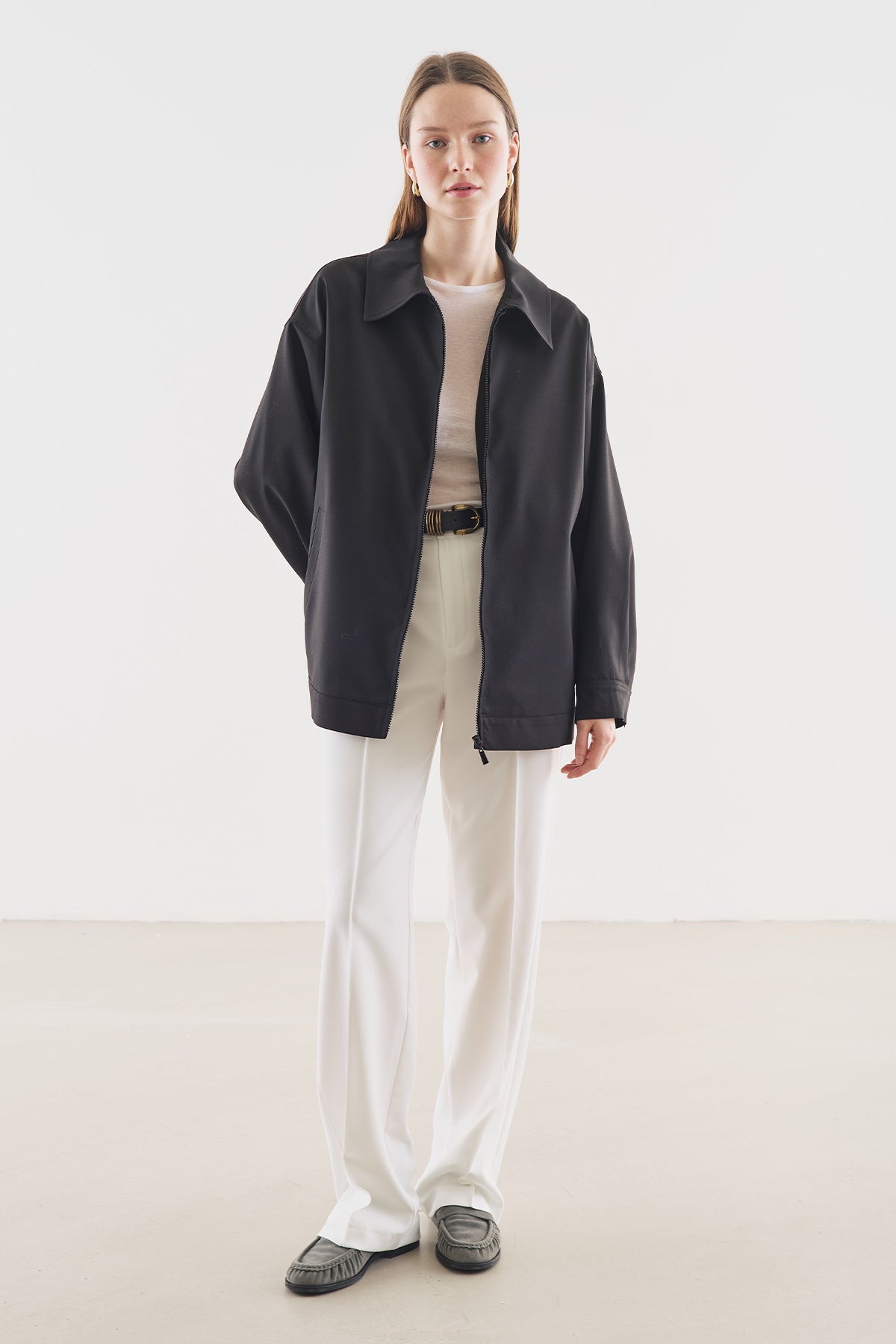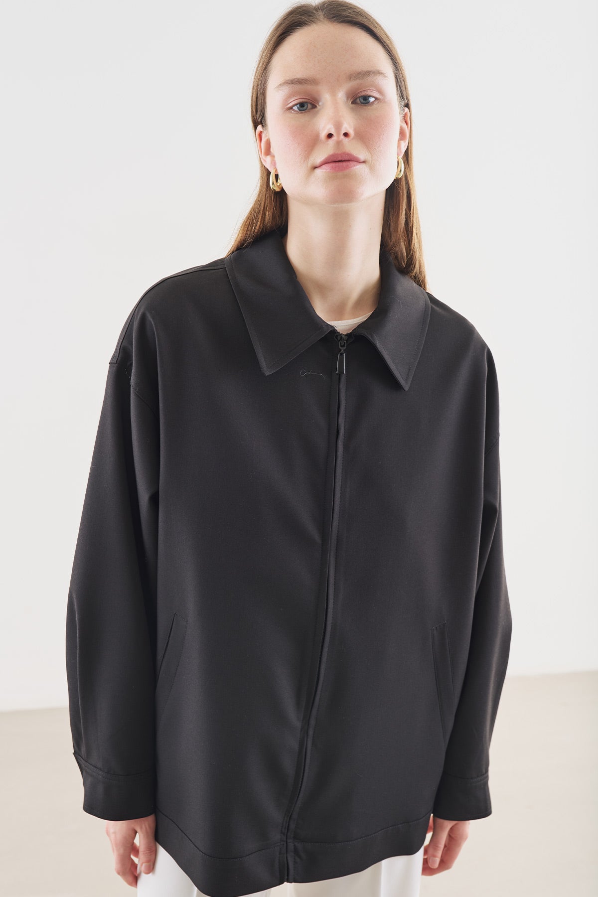 Regular kalıp, gömlek yaka, uzun kol, yanlardan cepli, pile detaylı, tunik boy, fermuar kapamalı.