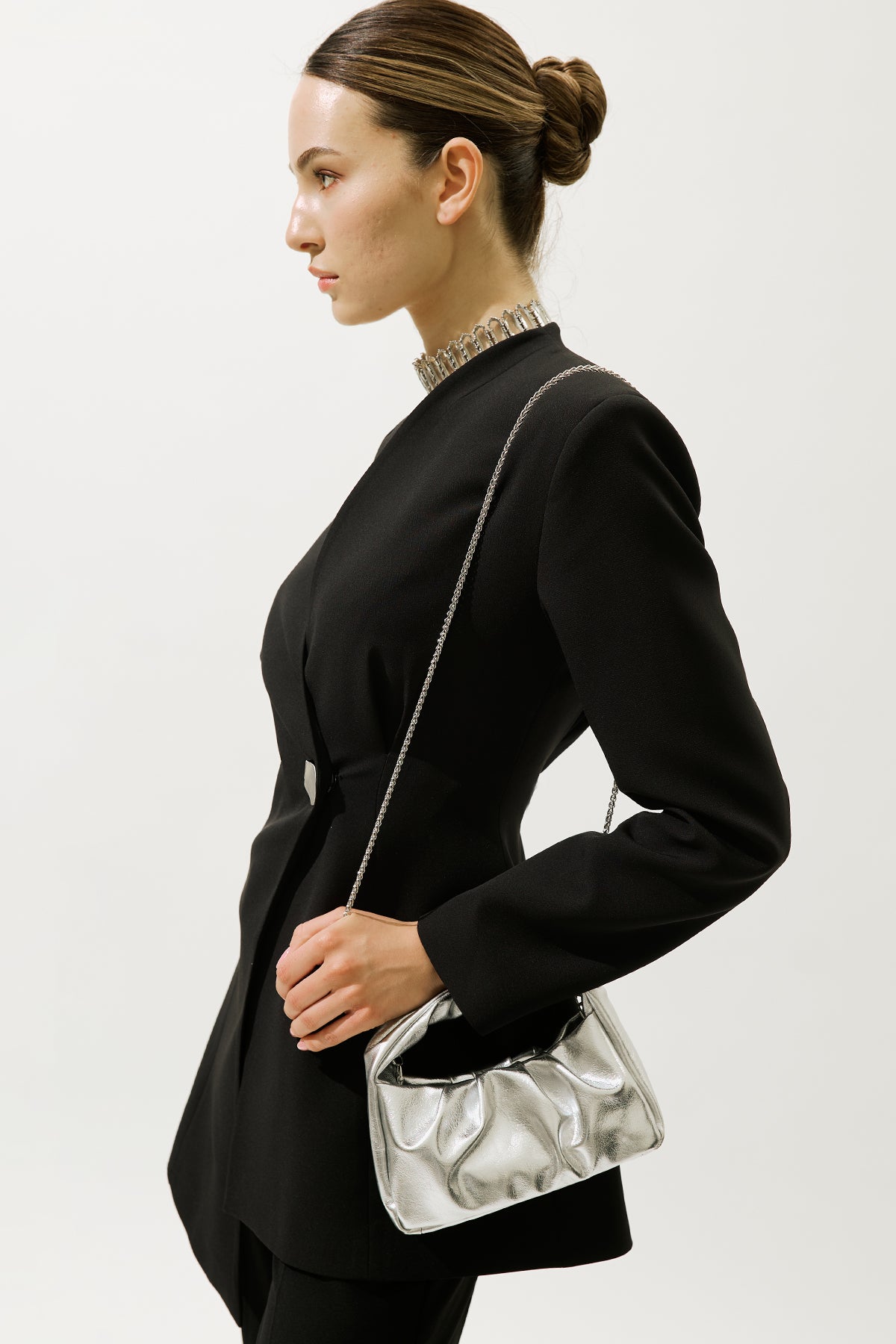 Altın tonlu detaylara sahip çıkarılabilir uzun askı