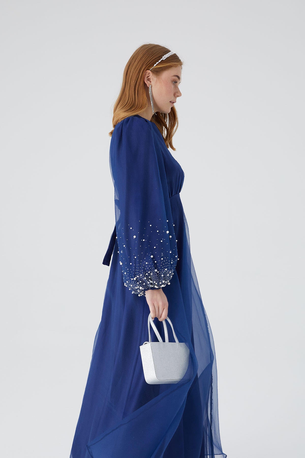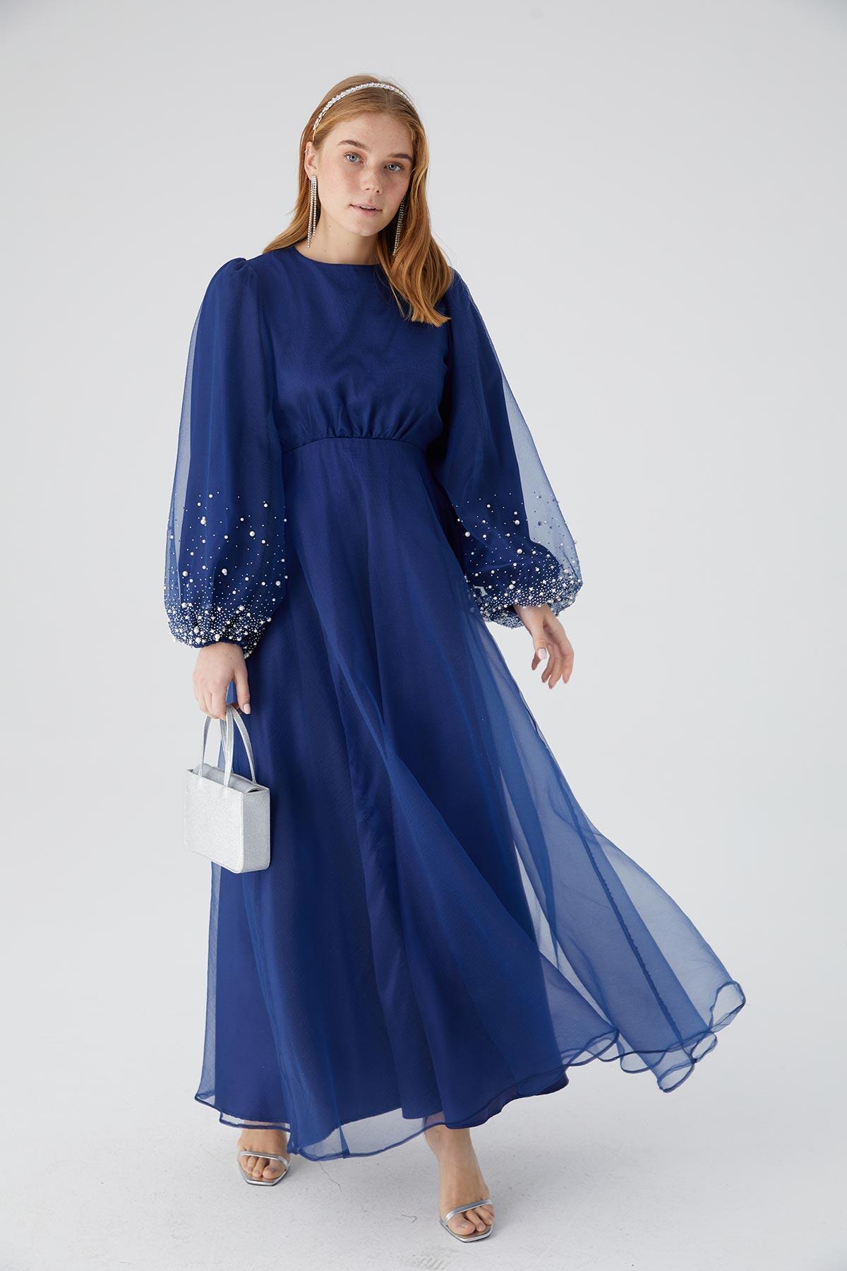 Organze Taş İşlemeli Abiye Elbise Lacivert