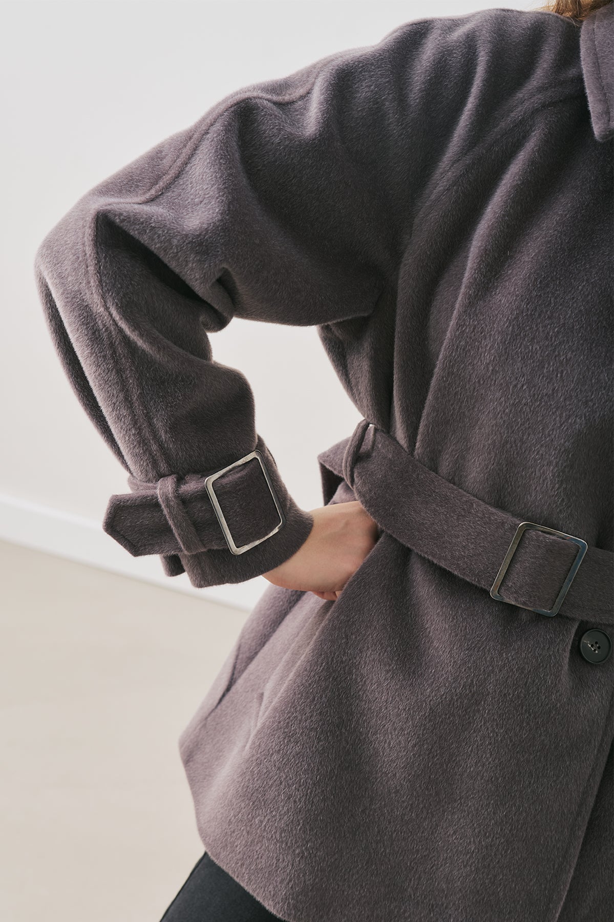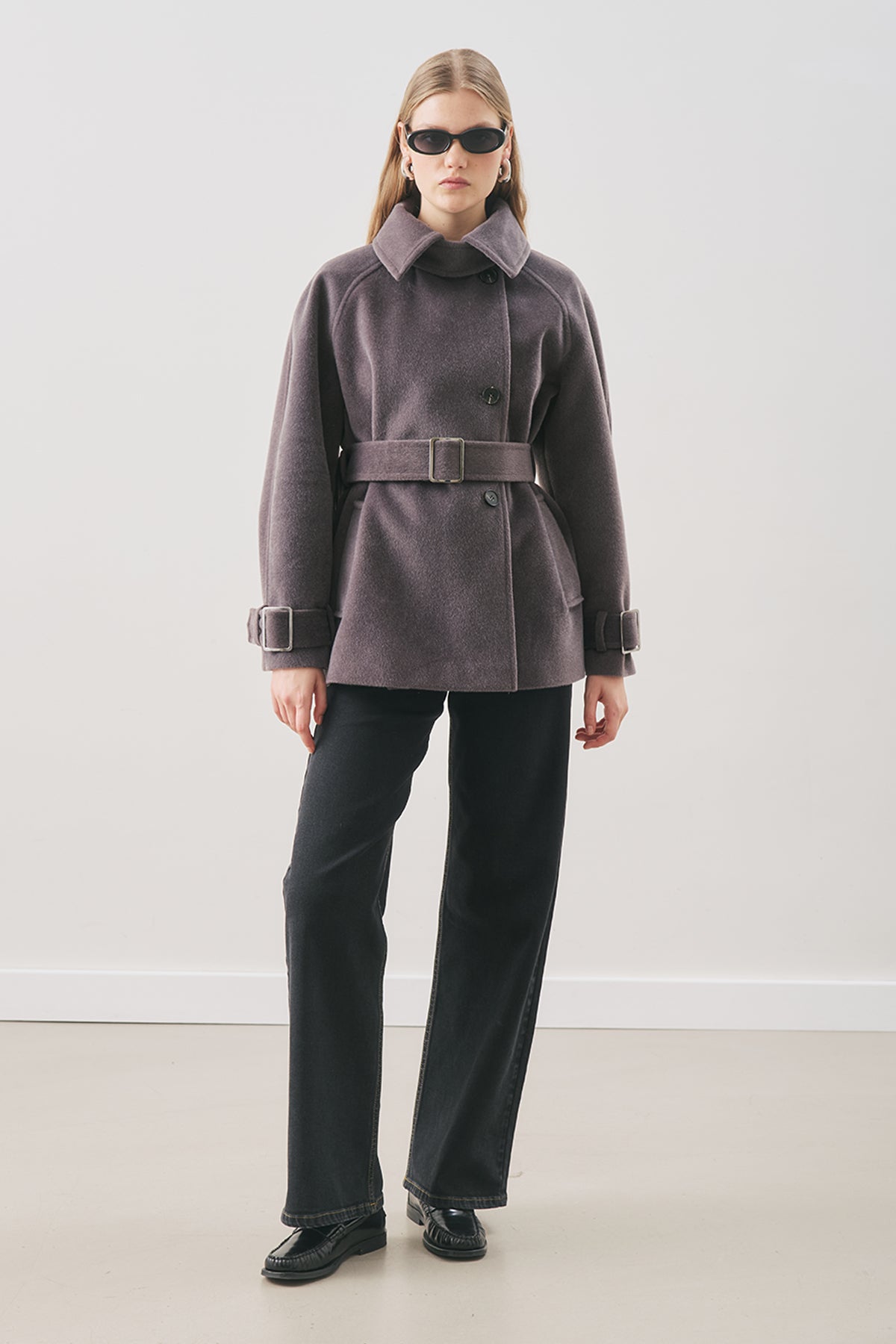 Norma kalıp,yüksek yaka-apolet detaylı,uzun kol,gizli pat kapamalı,belde kuşak detaylı,ara boy,düğme kapamalı, astarlı. Dokuma.