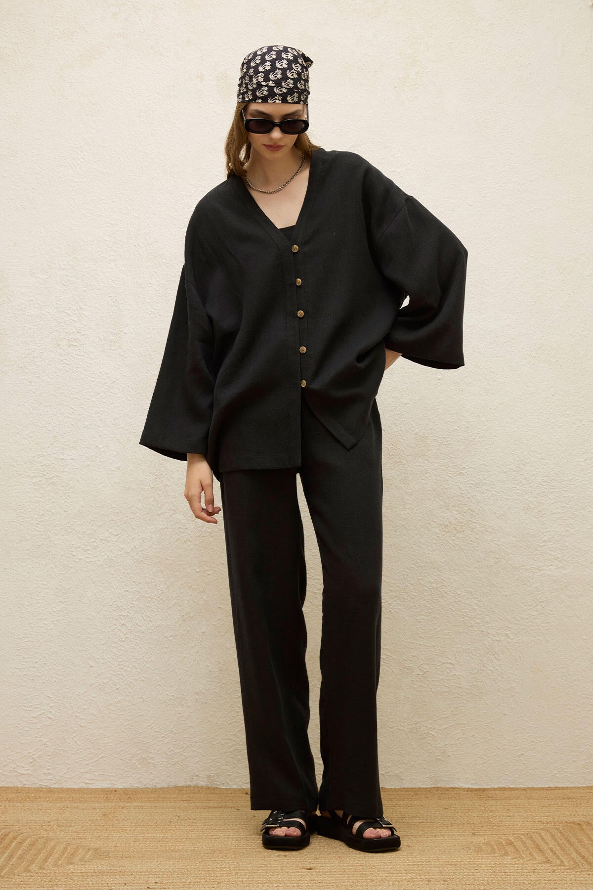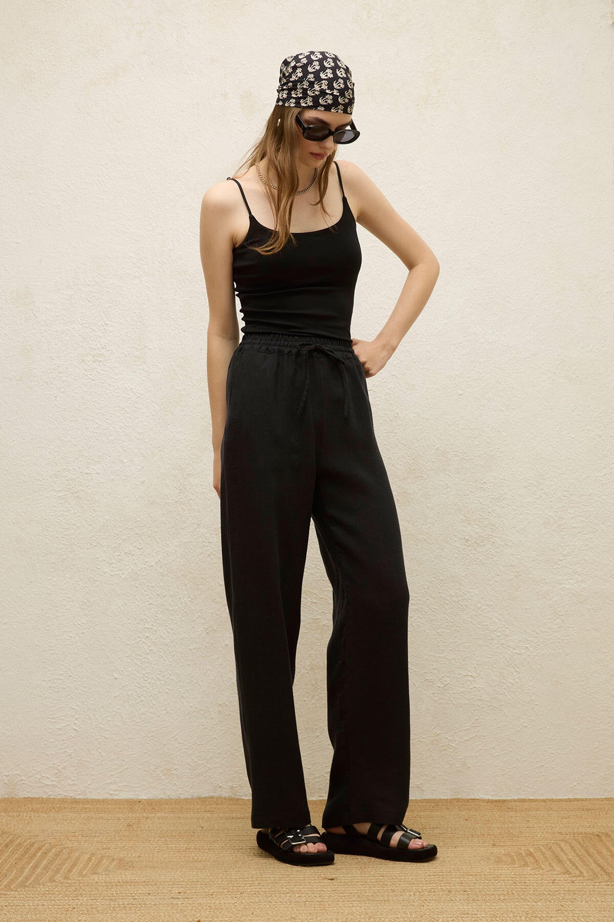 Bu yüksek belli, tam boy pantolon yan ceplere ve geniş paçalara sahiptir. %100 keten kumaştan üretilmiştir.
