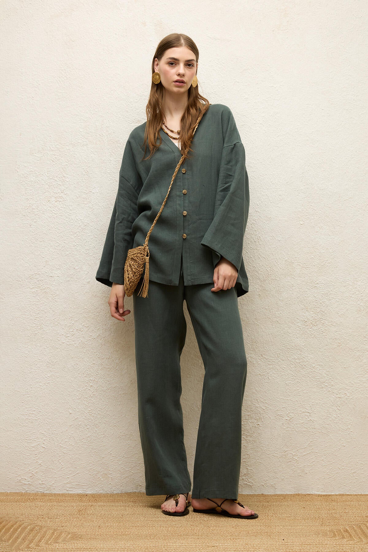 Bu yüksek belli, tam boy pantolon yan ceplere ve geniş paçalara sahiptir. %100 keten kumaştan üretilmiştir.