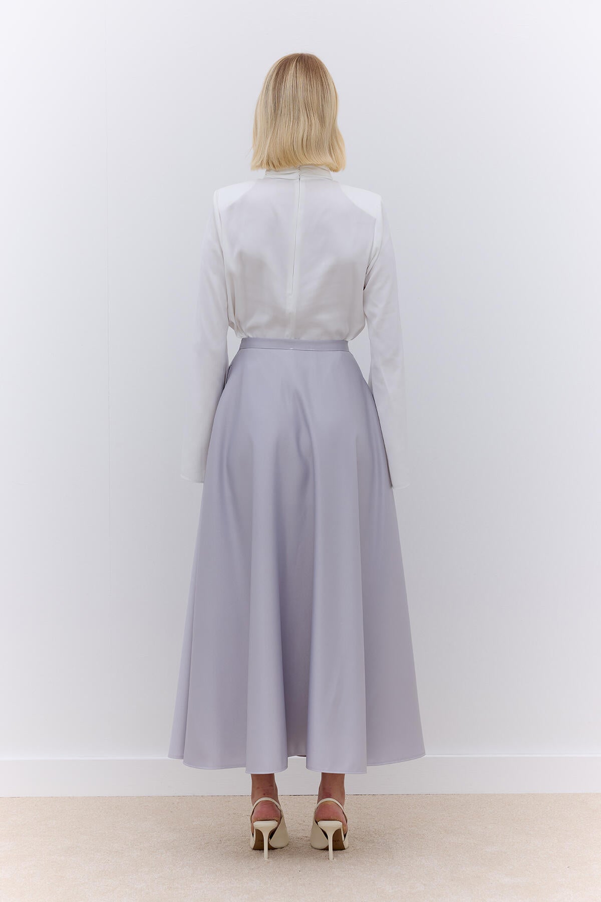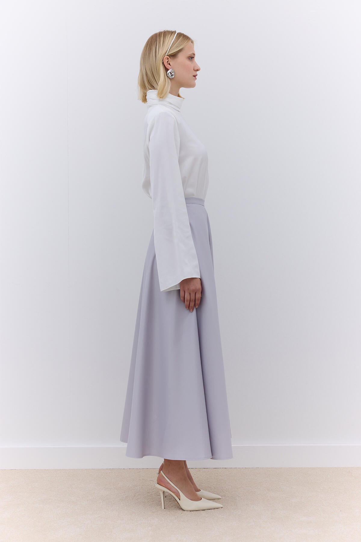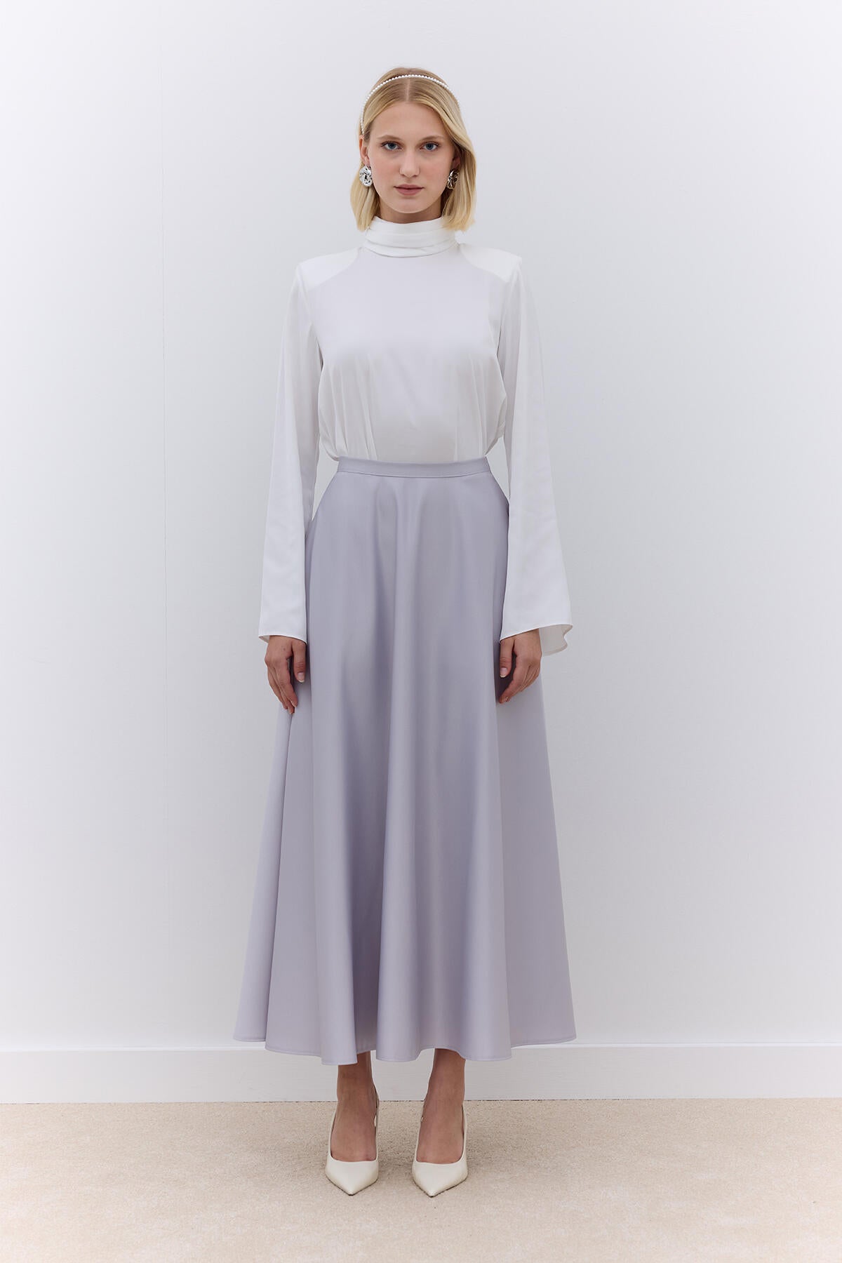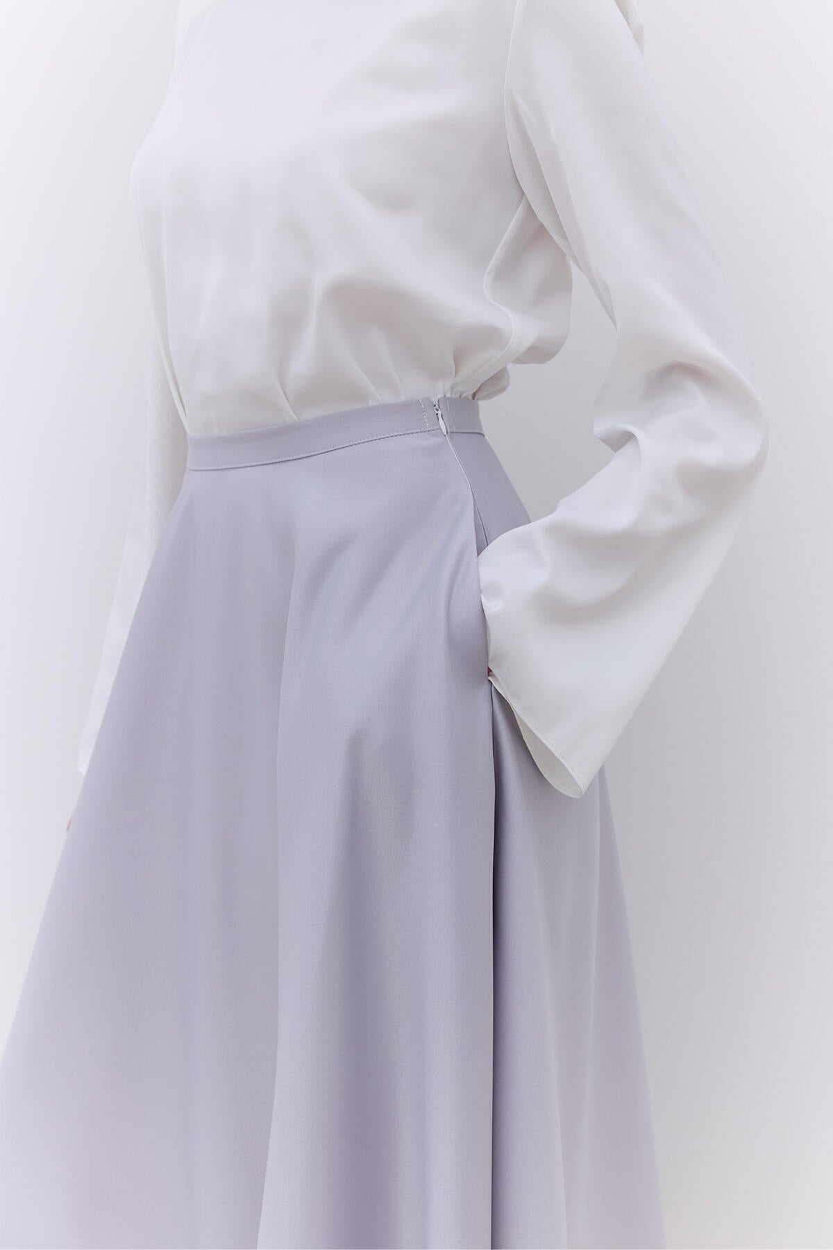 Bu zarif tam boy etek lüks saten kumaştan üretilmiştir ve geniş, kloş bir tasarıma sahiptir. Şık bir görünüm için kullanışlı yan cepler ve gizli fermuarlı kapatma içerir.