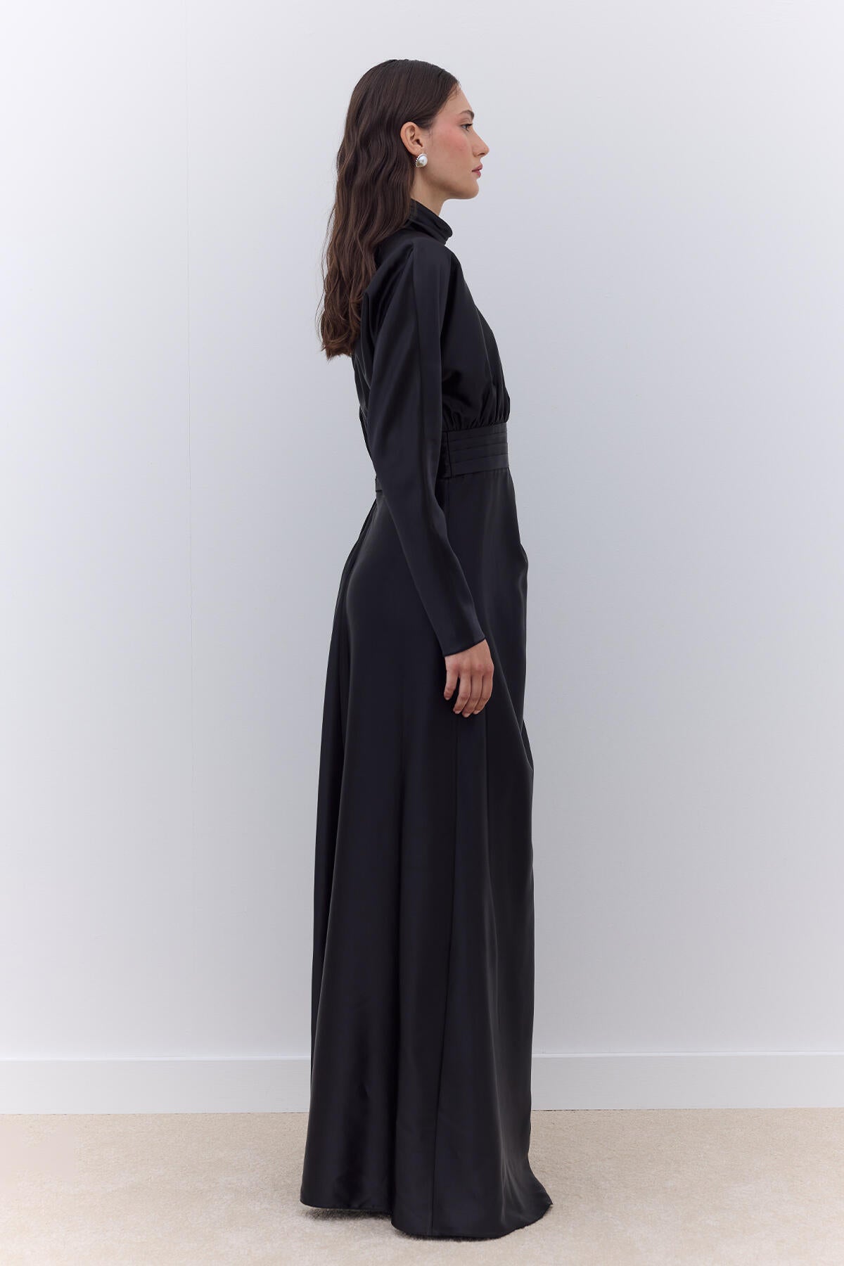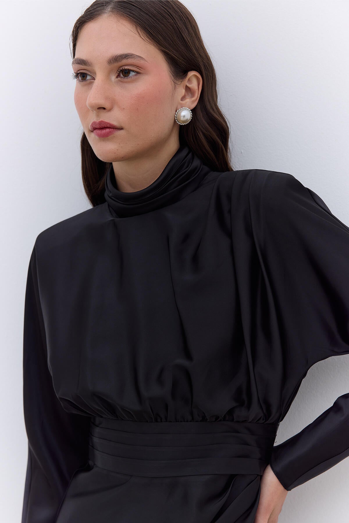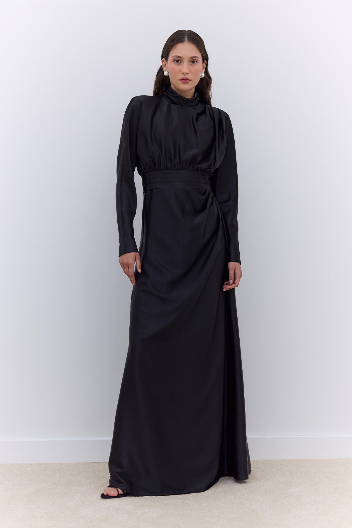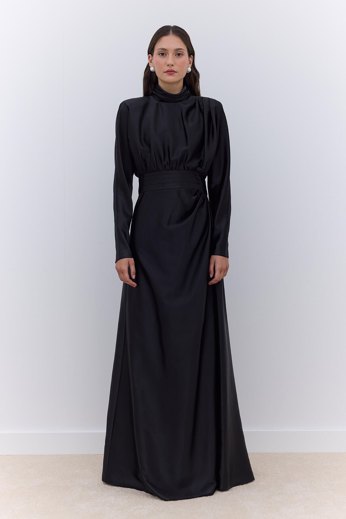 Bu zarif saten elbise tamamen astarlıdır ve gizli fermuarlı bir kapamaya sahiptir. Elbise, pileli omuz detayları, yüksek yaka ve büzgülü bel tasarımıyla süslenmiştir ve sofistike silüetini zenginleştirir. Dolgulu omuzlar yapı ve zarafet katar.