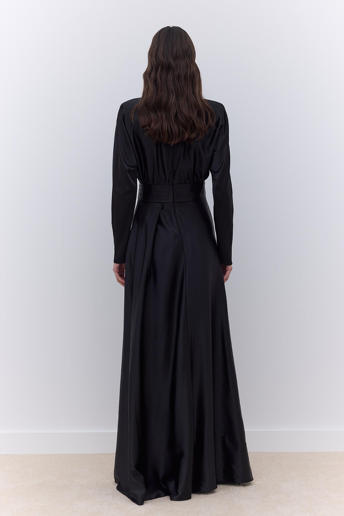 Saten Drapeli Omuz Abiye Elbise Siyah