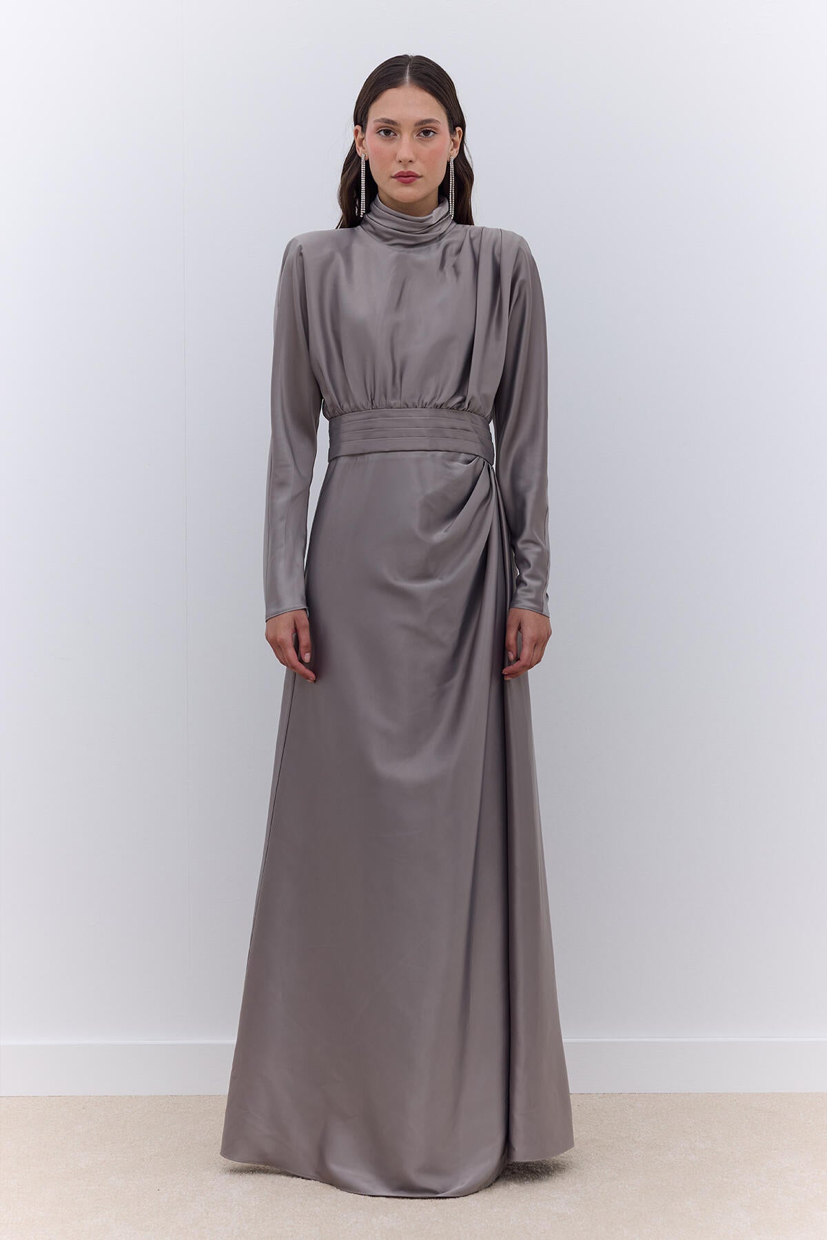 Bu zarif saten elbise tamamen astarlıdır ve gizli fermuarlı bir kapamaya sahiptir. Elbise, pileli omuz detayları, yüksek yaka ve büzgülü bel tasarımıyla süslenmiştir ve sofistike silüetini zenginleştirir. Dolgulu omuzlar yapı ve zarafet katar.
