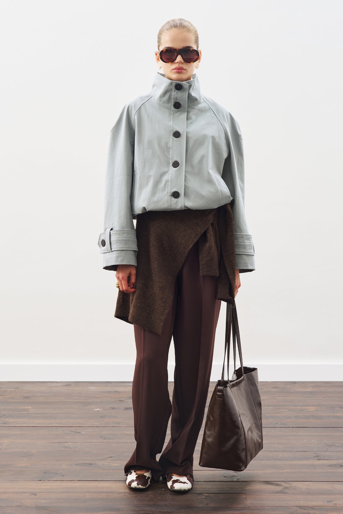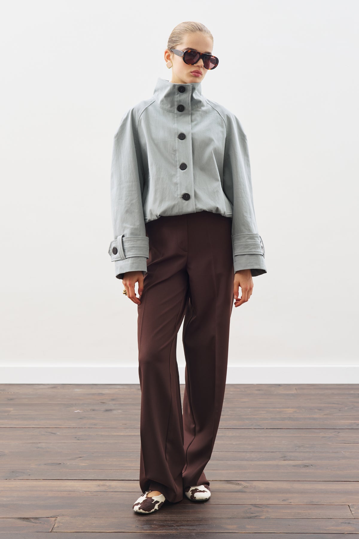 Dik yakalı, uzun kollu, crop boy, düğmeli kapamalı, astarlı, normal kalıp, dokuma kumaş.