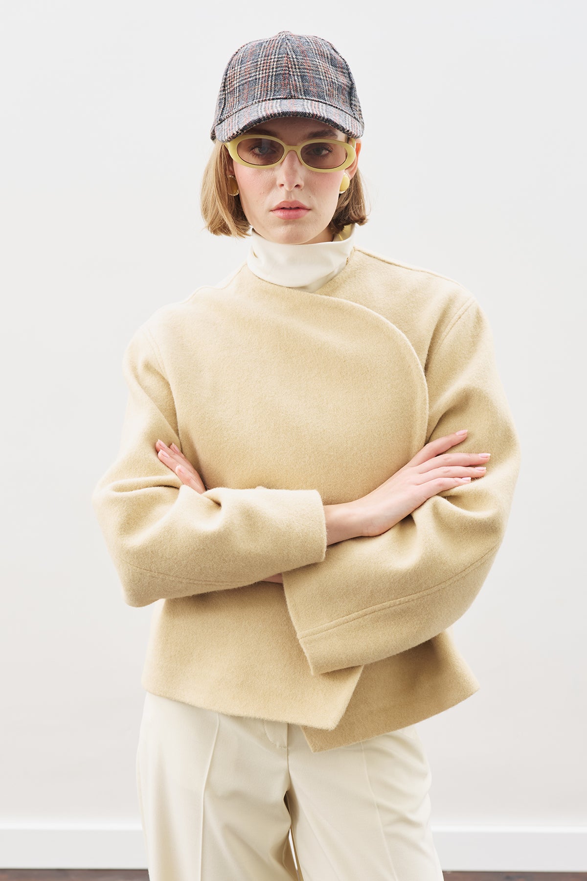 Geniş yakalı, uzun kollu, crop boy, düz kapamalı, normal kalıp, dokuma kumaş.